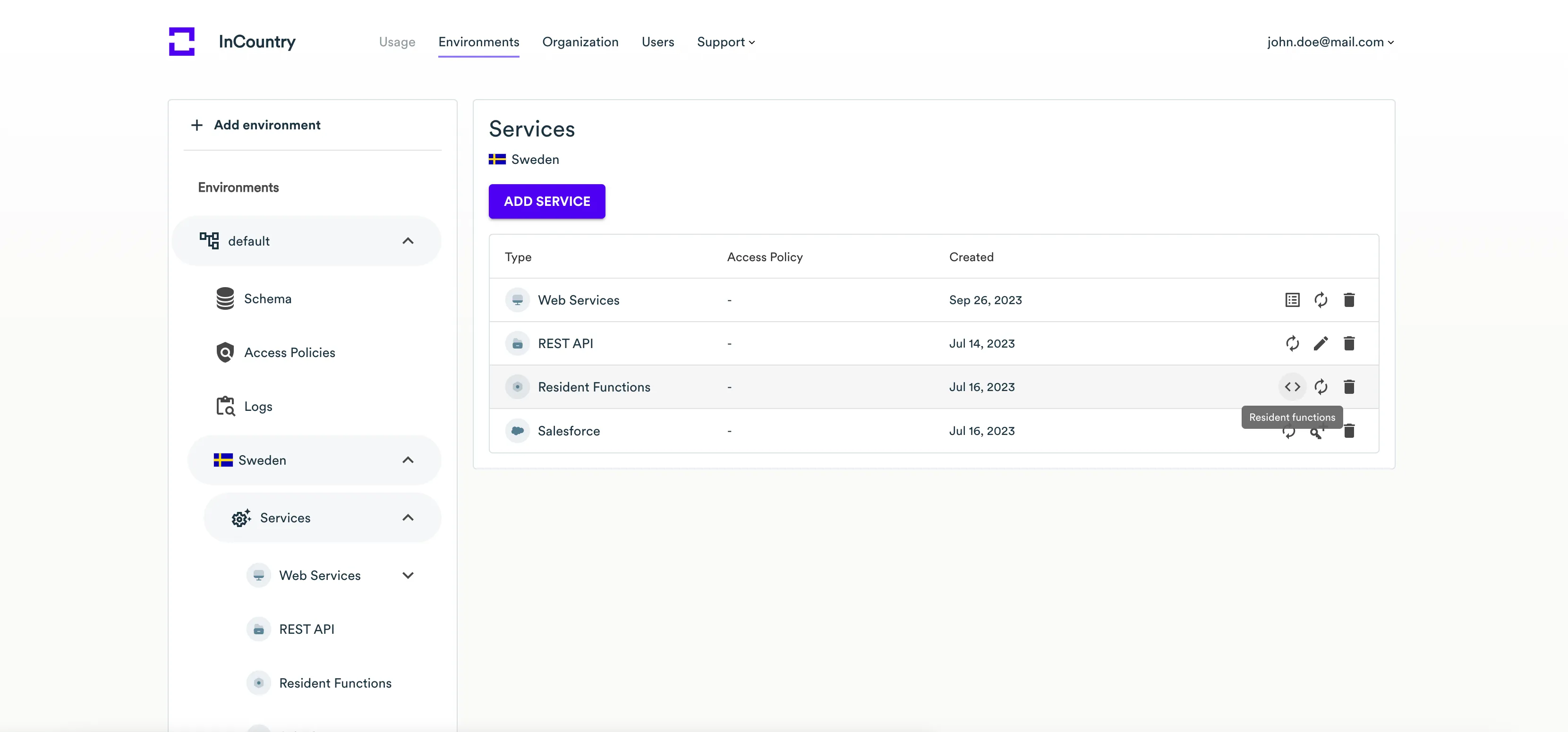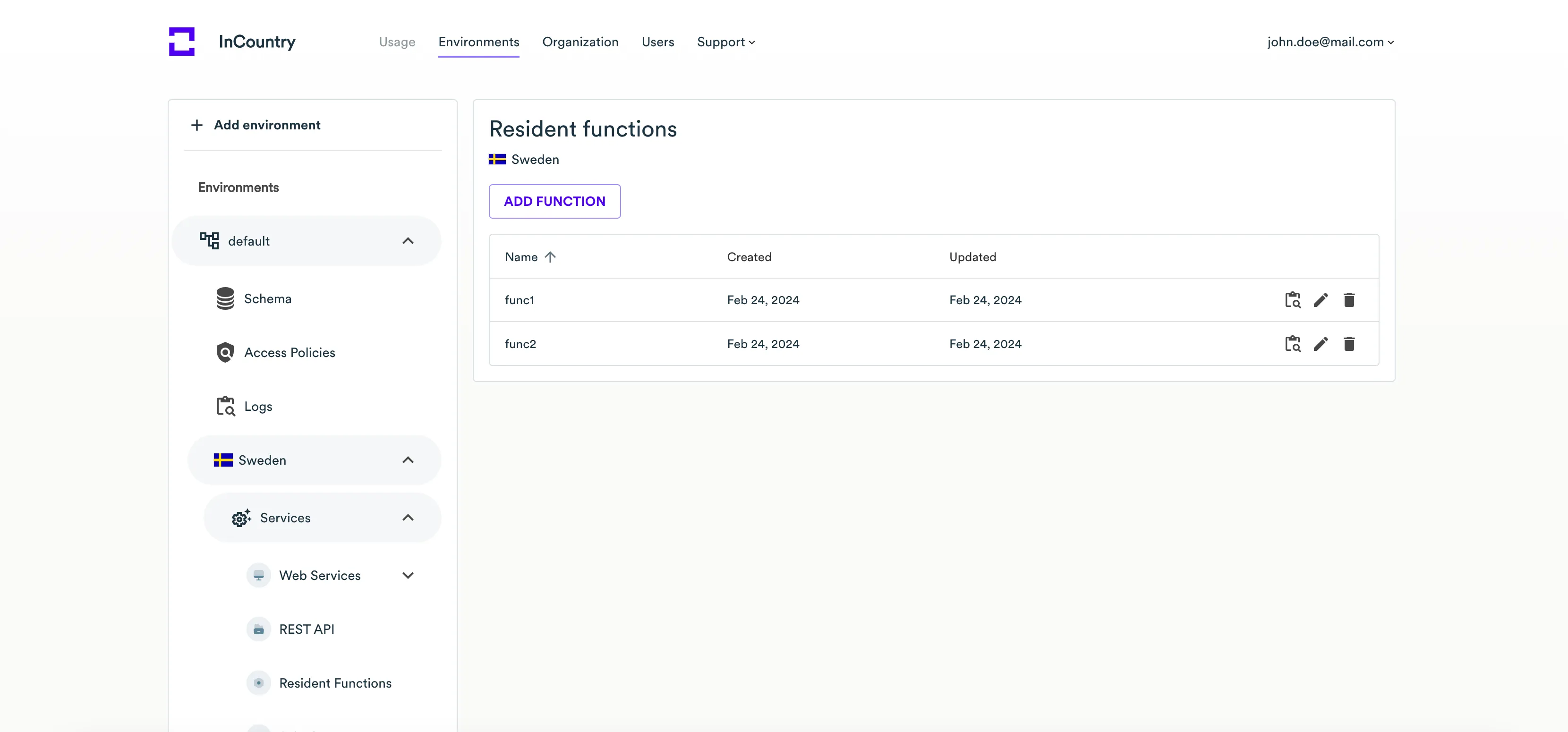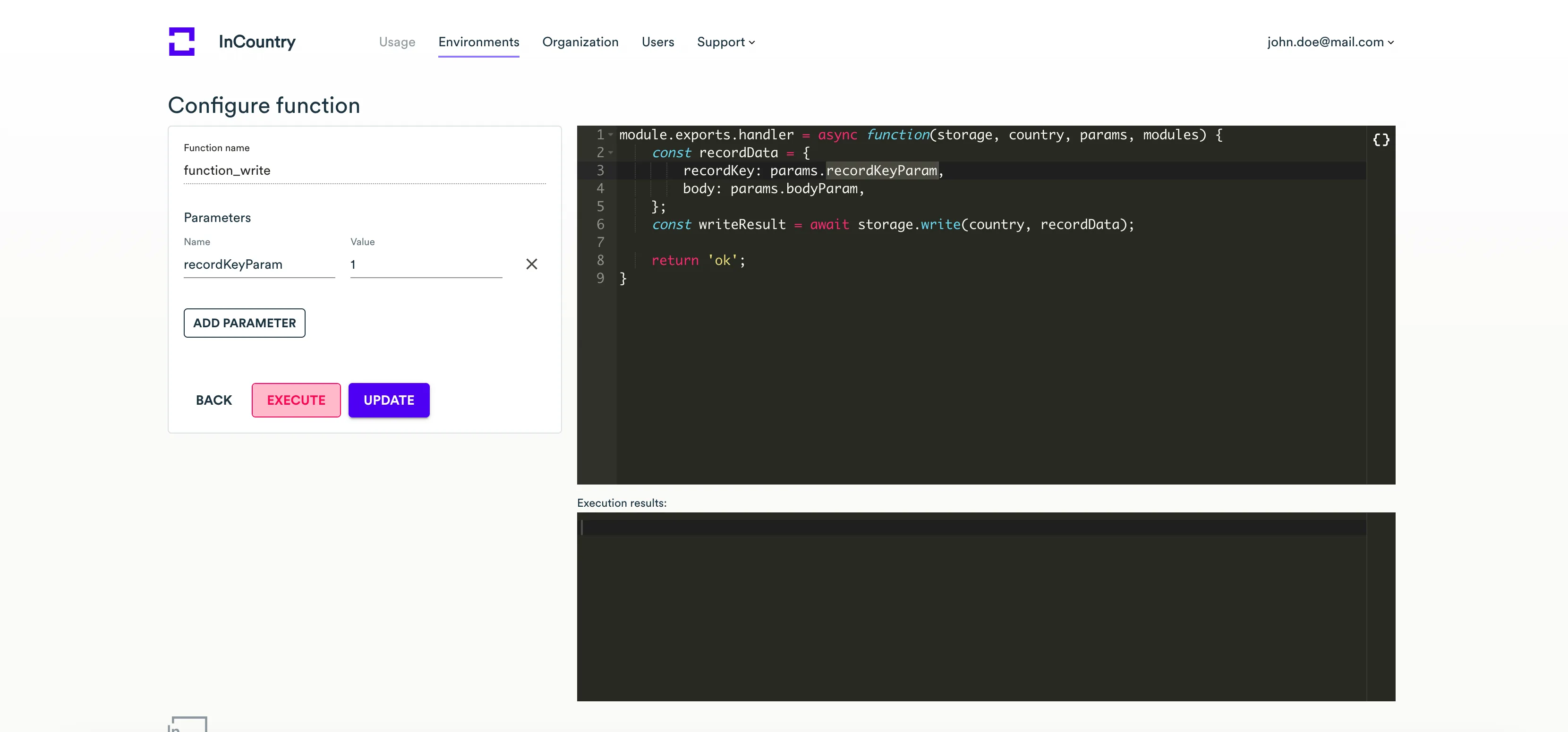 When you execute a resident function, the REST API fetches the required resident function by its name from PoP API and executes its code against records stored on the InCountry platform.