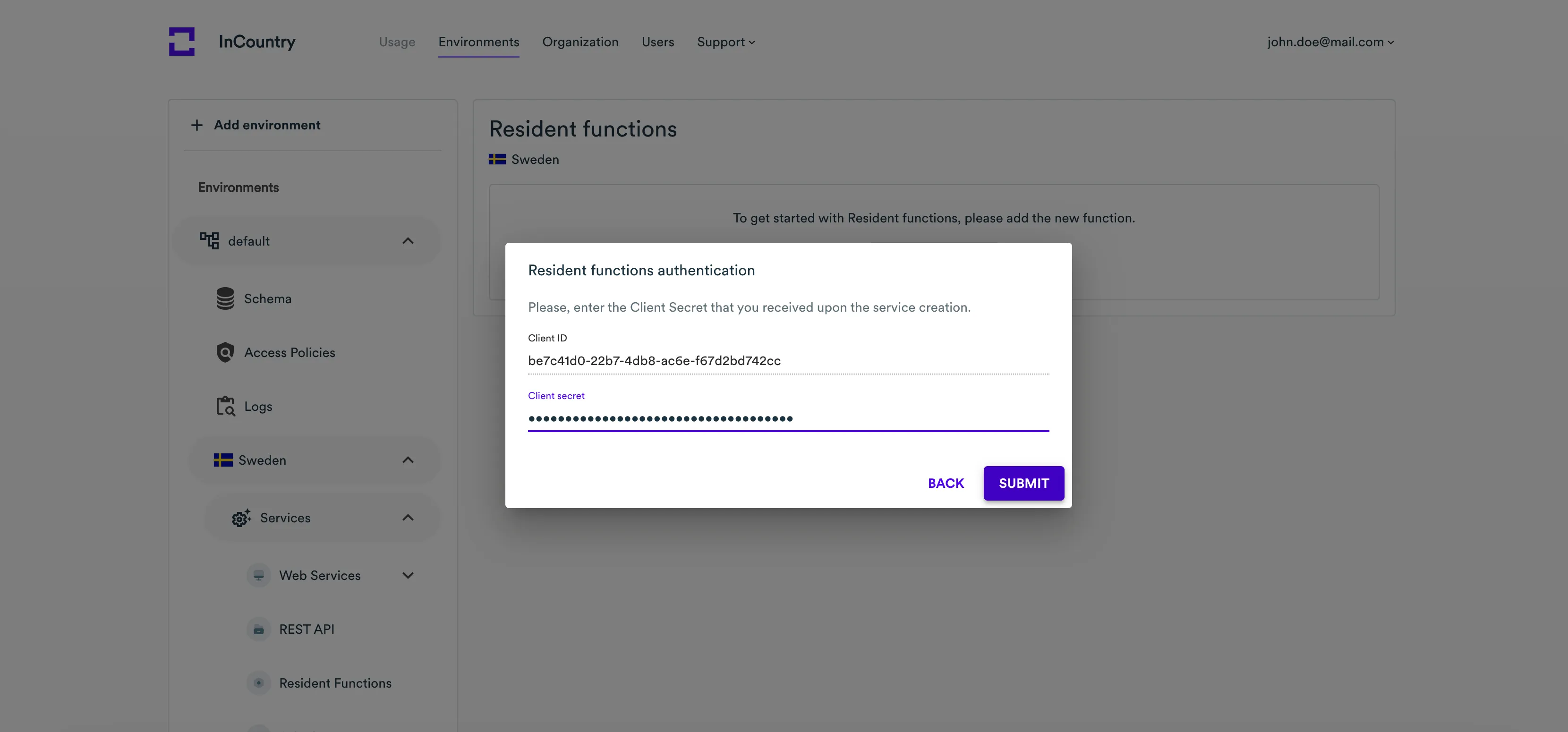 Click the Resident functions icon. You may be prompted to enter the Client Secret pertaining to the service of the
