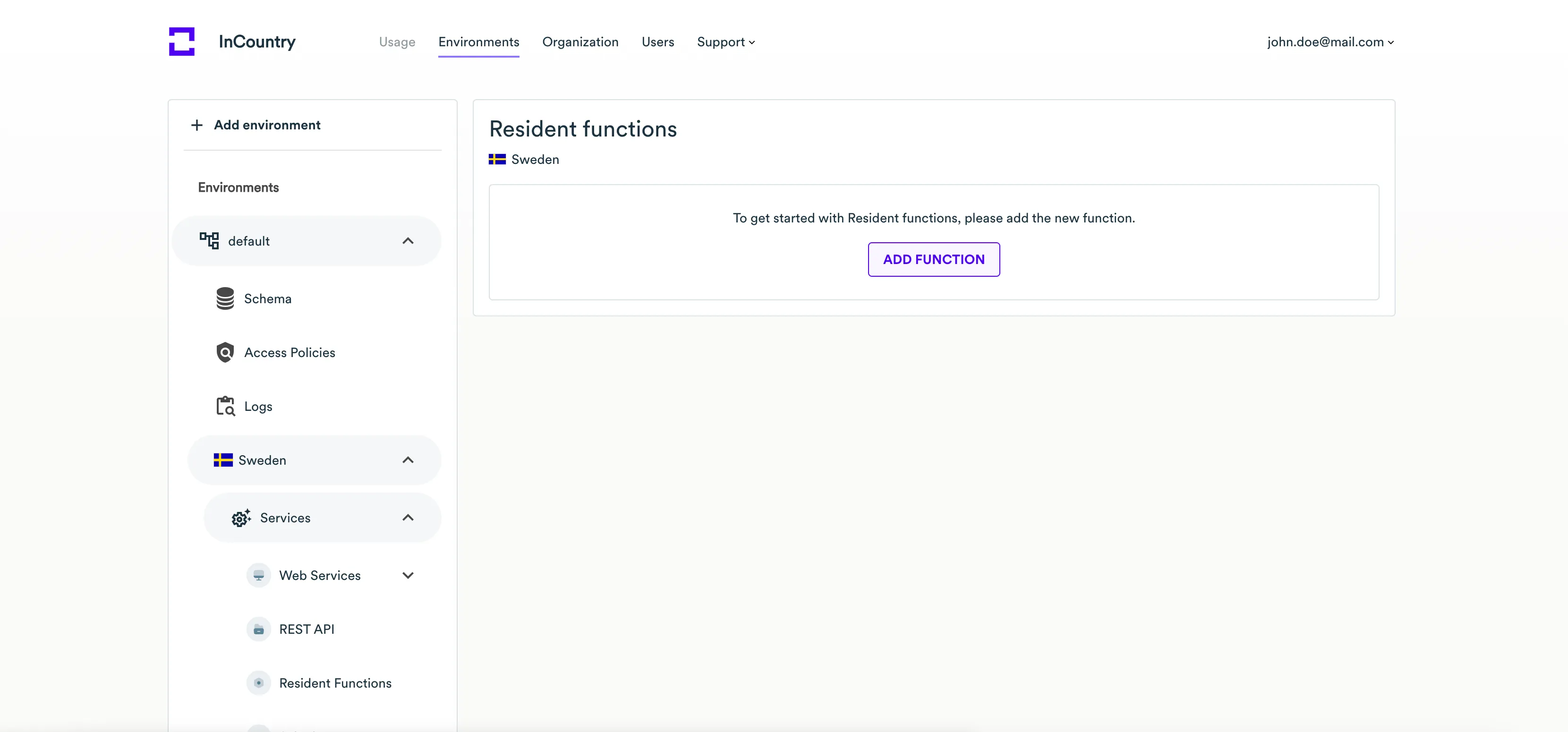 Expand the environment and country in the left sidebar where you want to add a resident function.