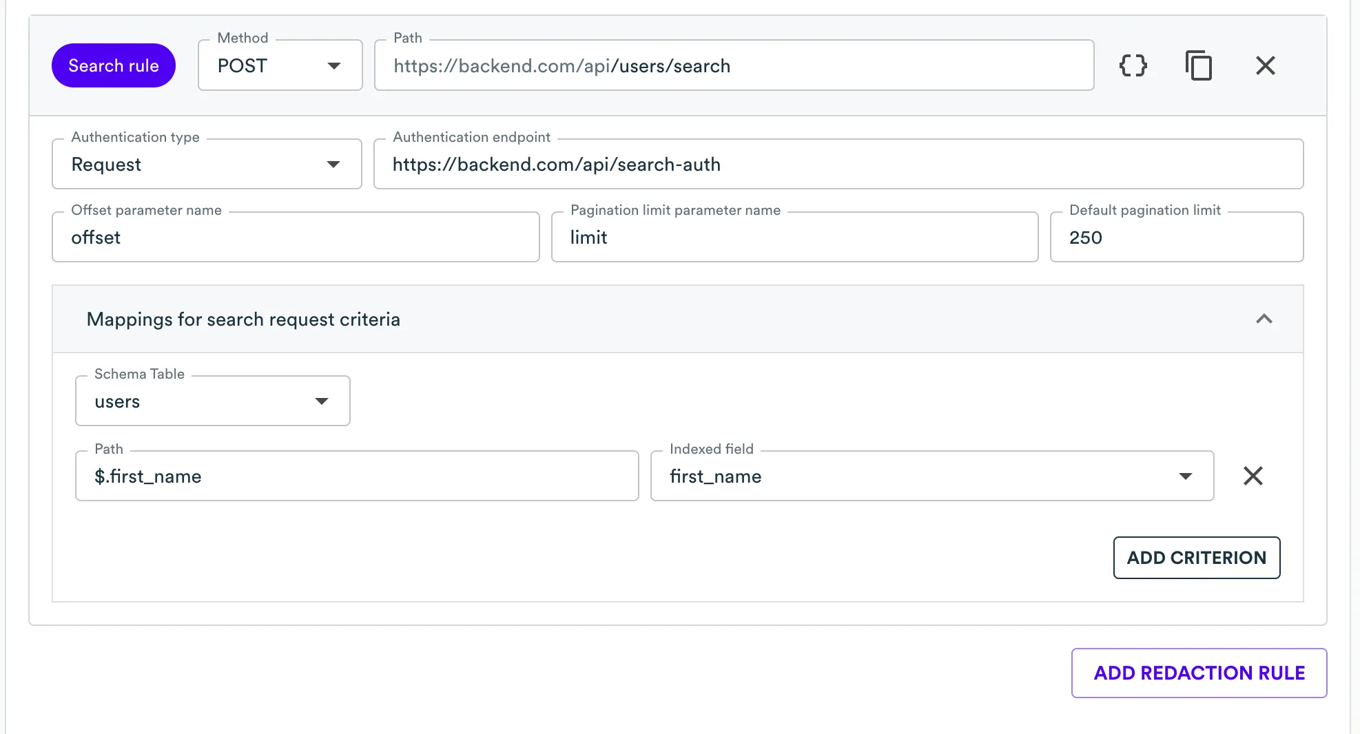 Search redaction rule can be using same "ADD REDACTION RULE" button.