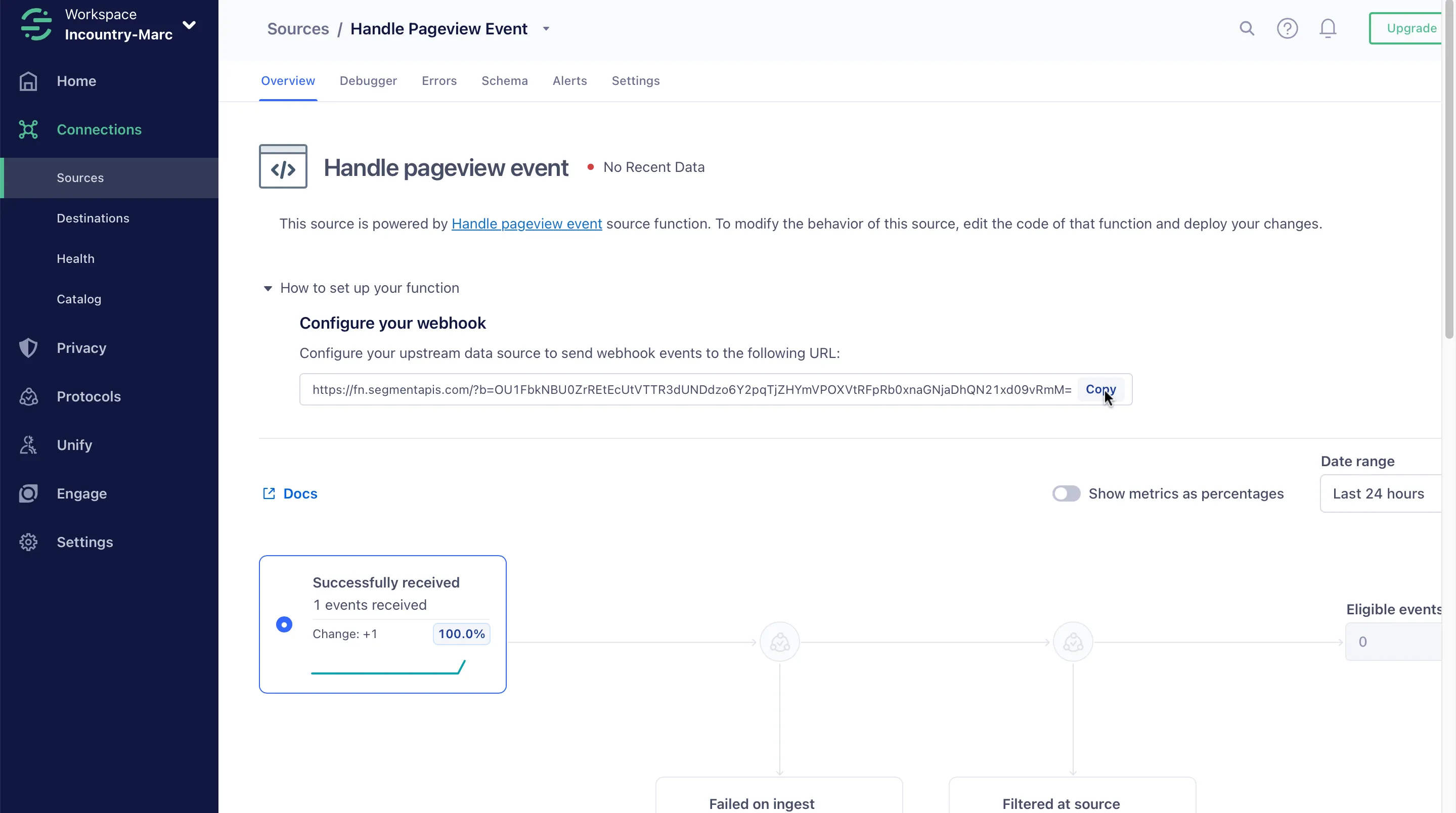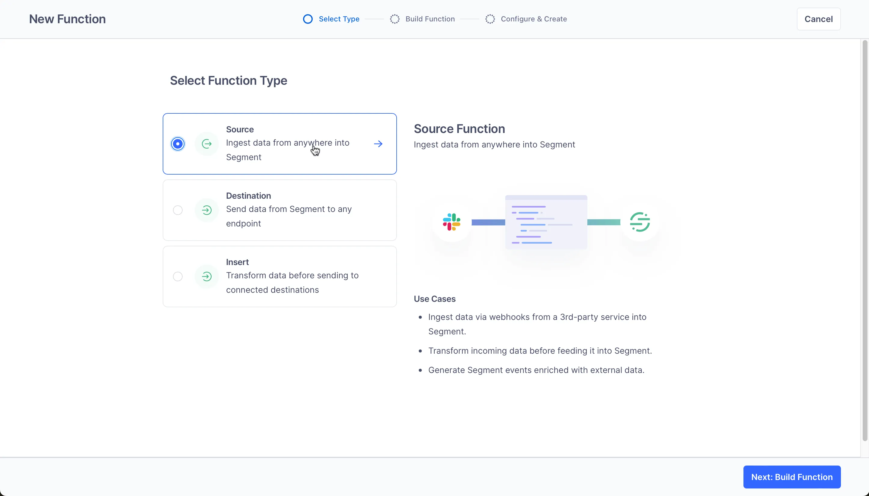In the next step, you can choose when to run this function. For example, you can do it before the data is ingested into Segment by using an HTTP request.