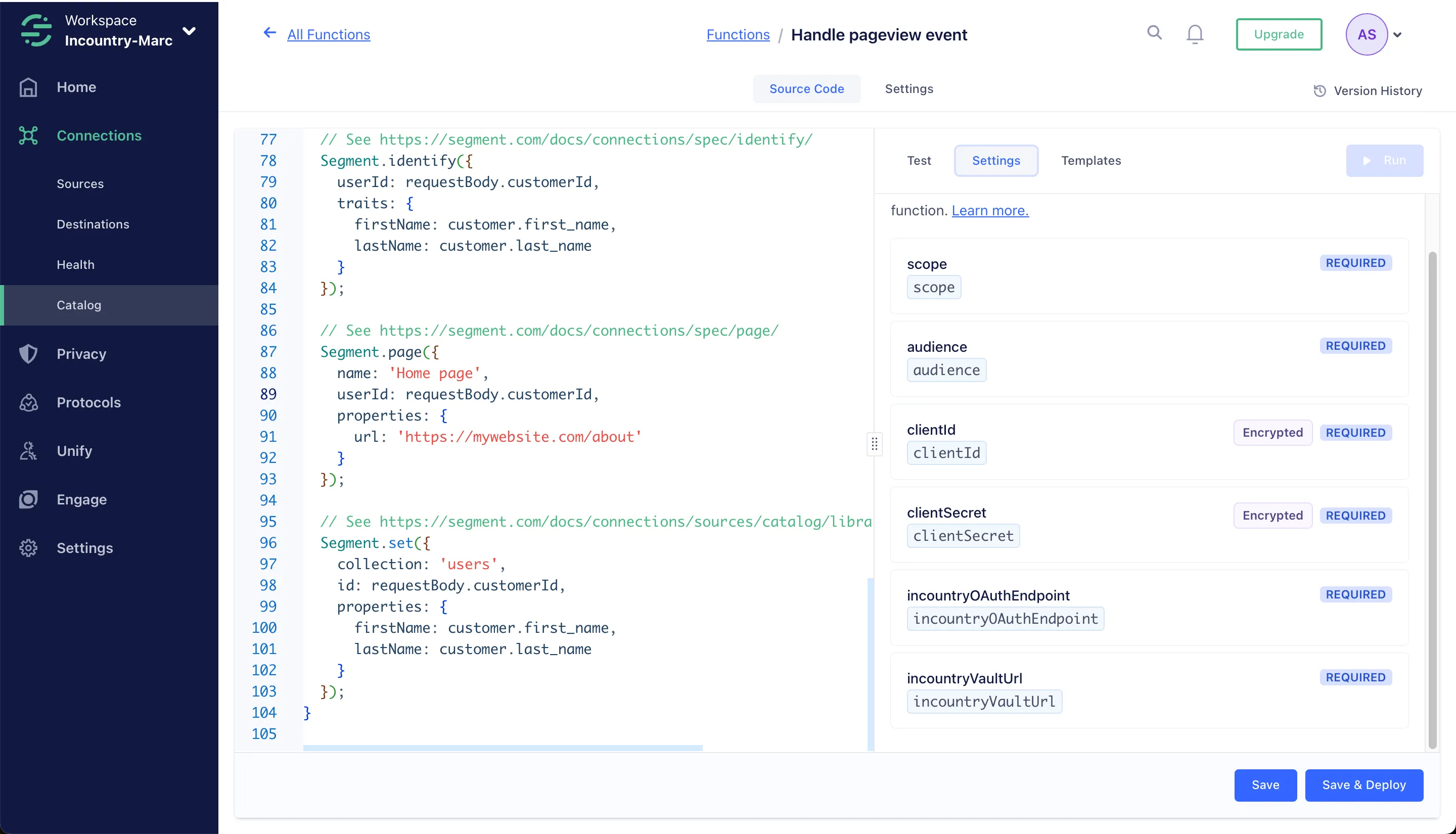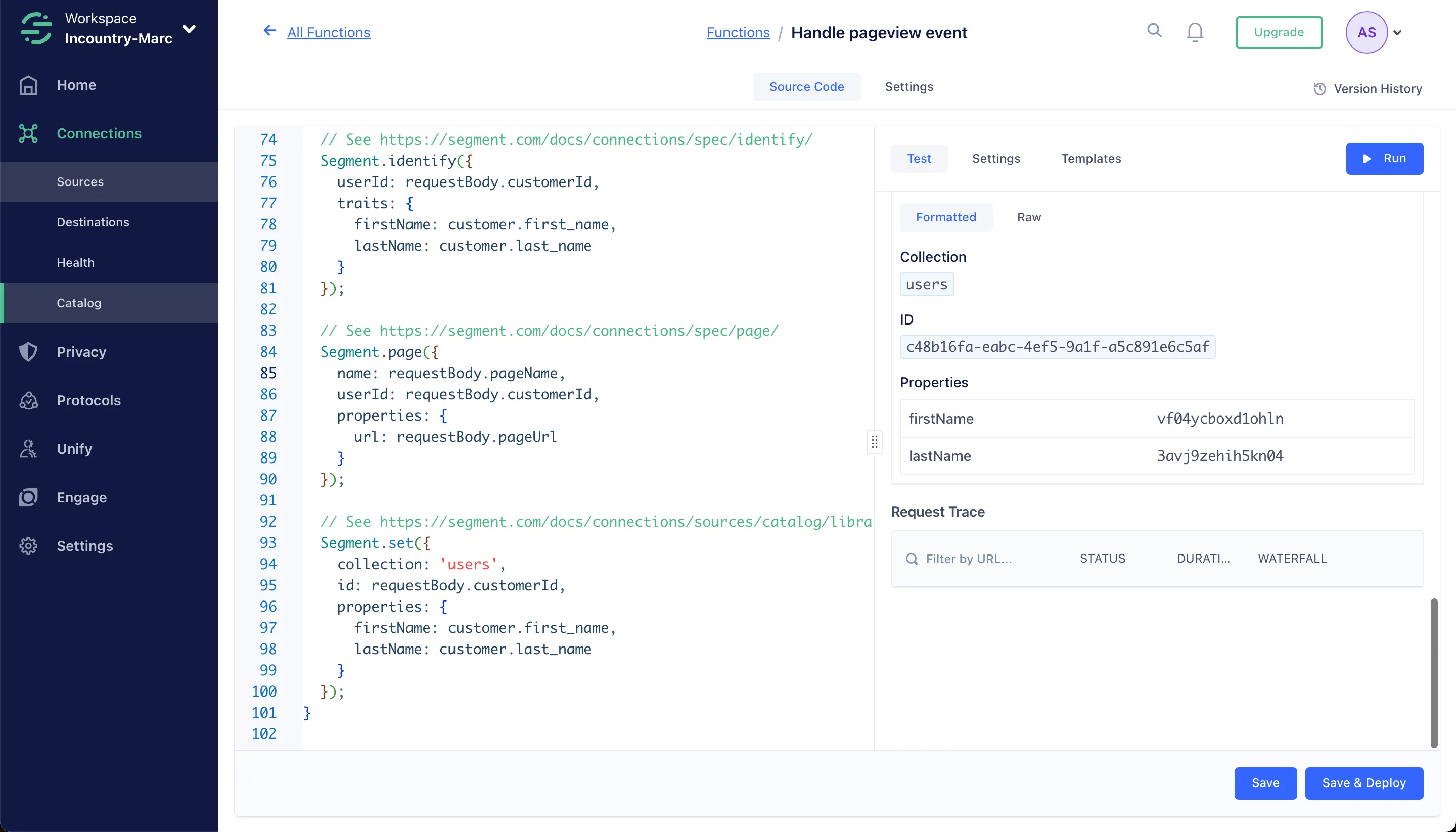 firstNameandlastNamefields and a page event on the Segment side.Below is an example of a simple function in Segment, which is on the screenshots above and which implements the described case.