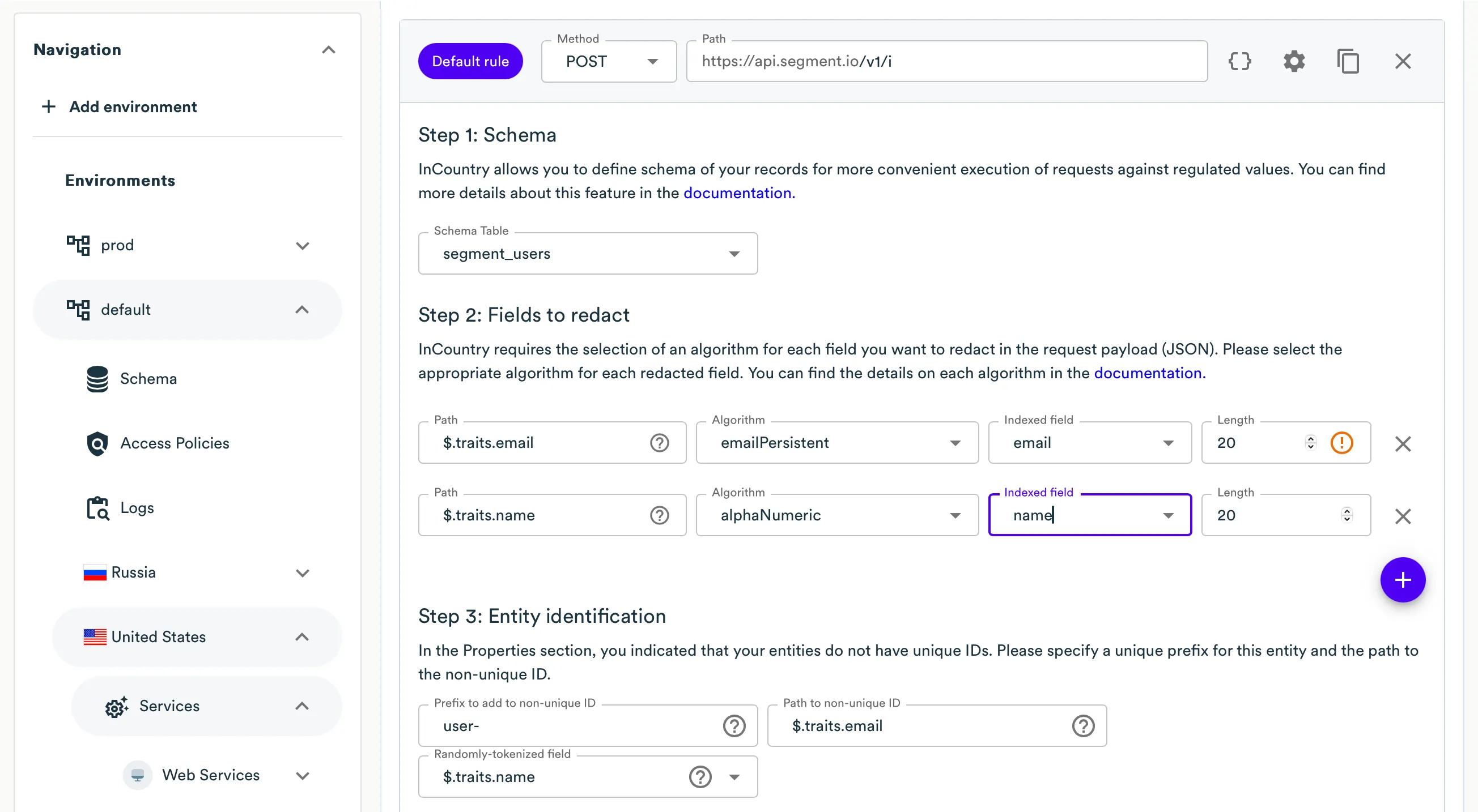 InCountry operates seamlessly with Segment to dynamically redact regulated fields and insert anonymized values in their place. Regulated data is fully isolated in the country of origin in InCountry’s point-of-presence.