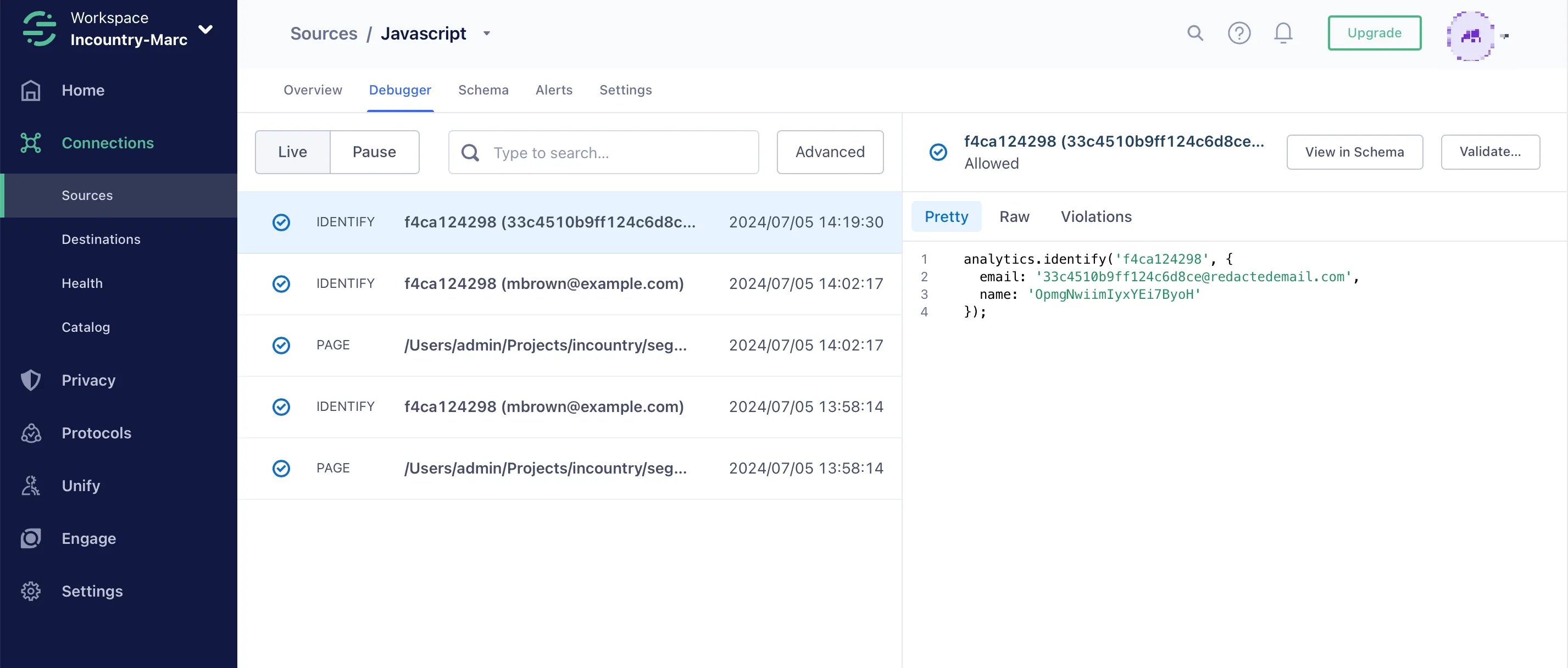 The following screenshot shows when the redacted identify event arrived in Segment.