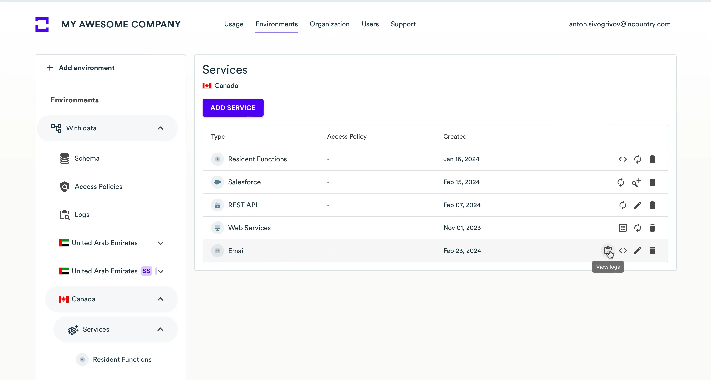 - On the list of services within an activated country, locate the Email service of which you would like to see logs.