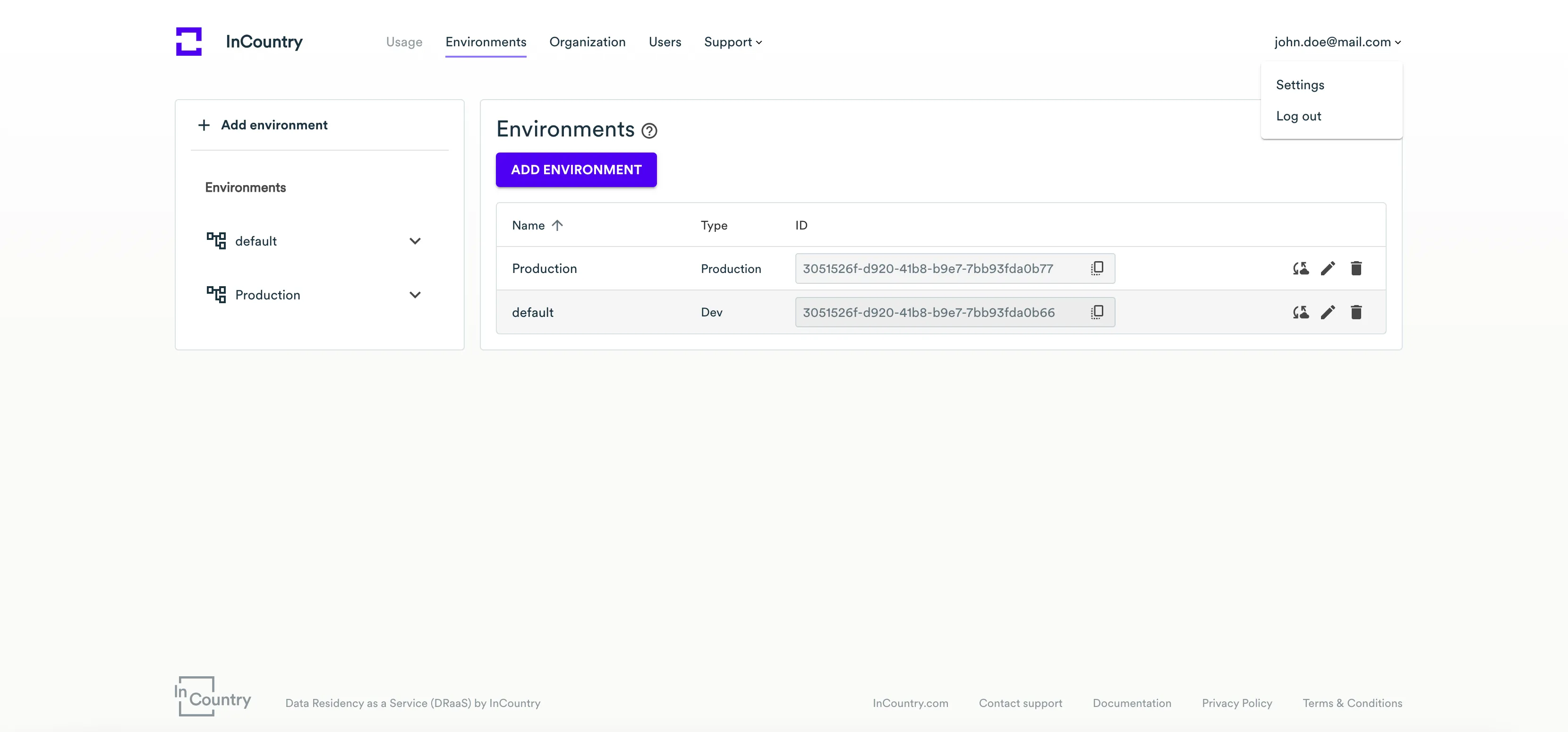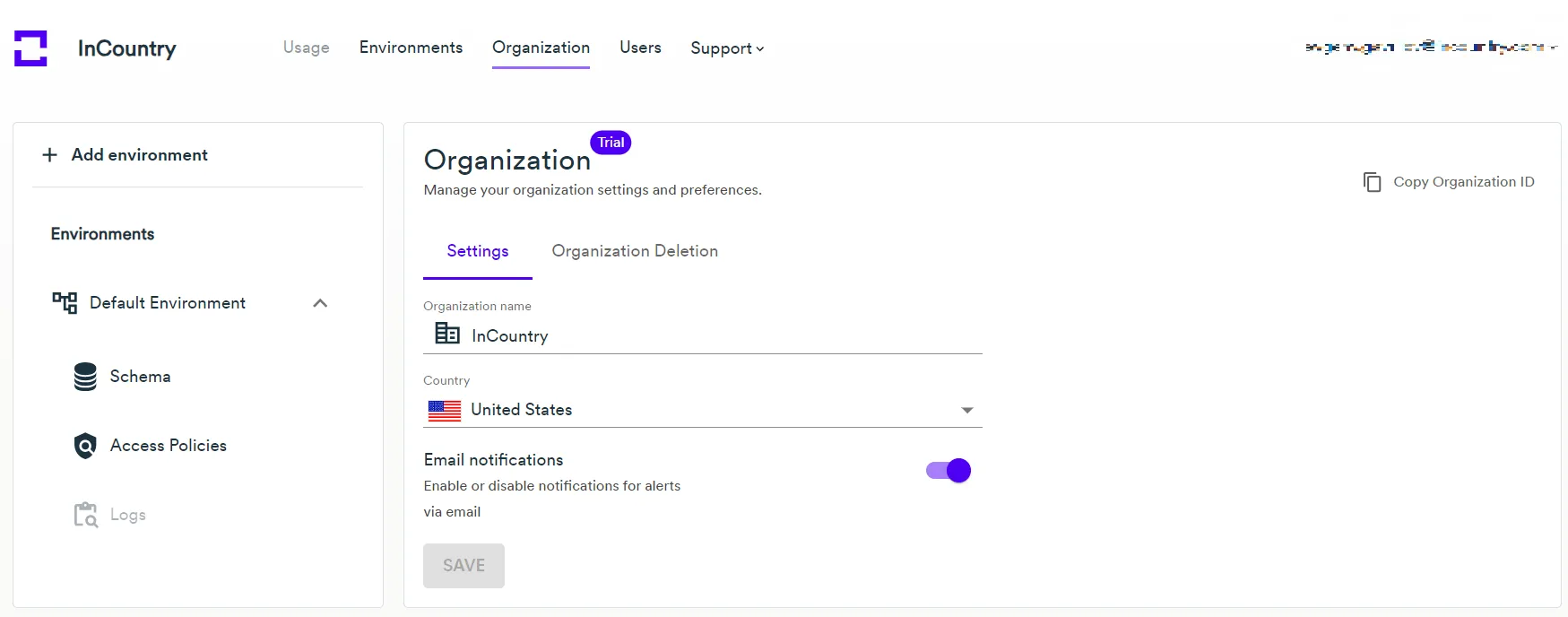 You can get Email notifications for alerts on Web Services. When an alert on Web Services occurs, InCountry Portal sends a notification to the administrator or owner of the organization. For example, Email Gateway error alerts are supported, they contain a link to the environment the error is related to. The "Email notifications" checkbox is enabled by default.