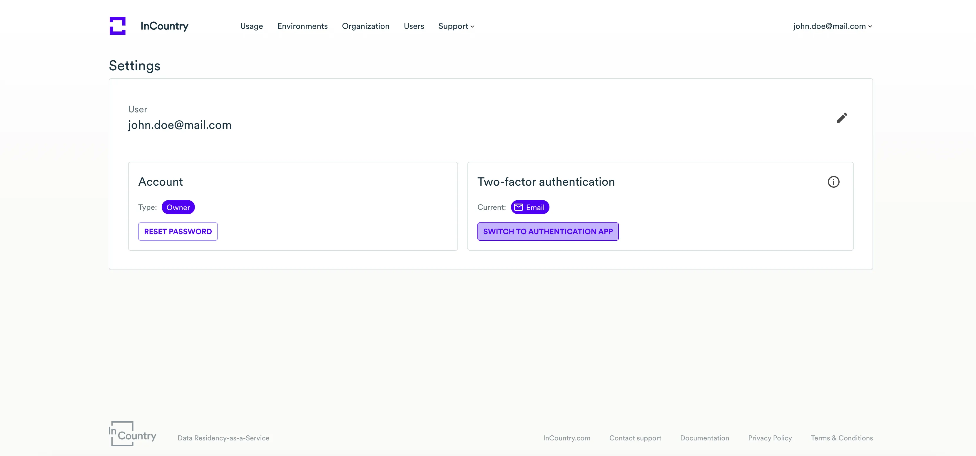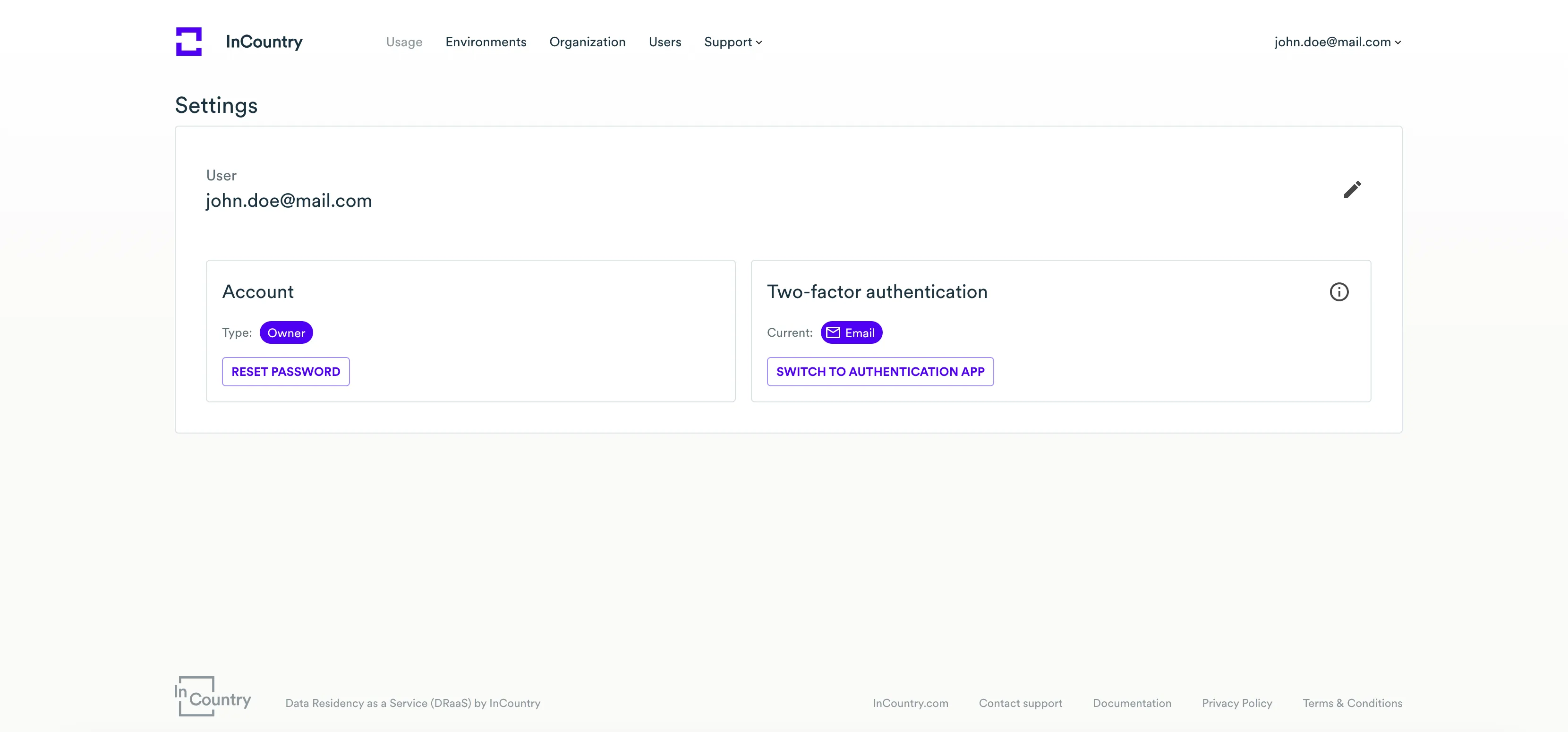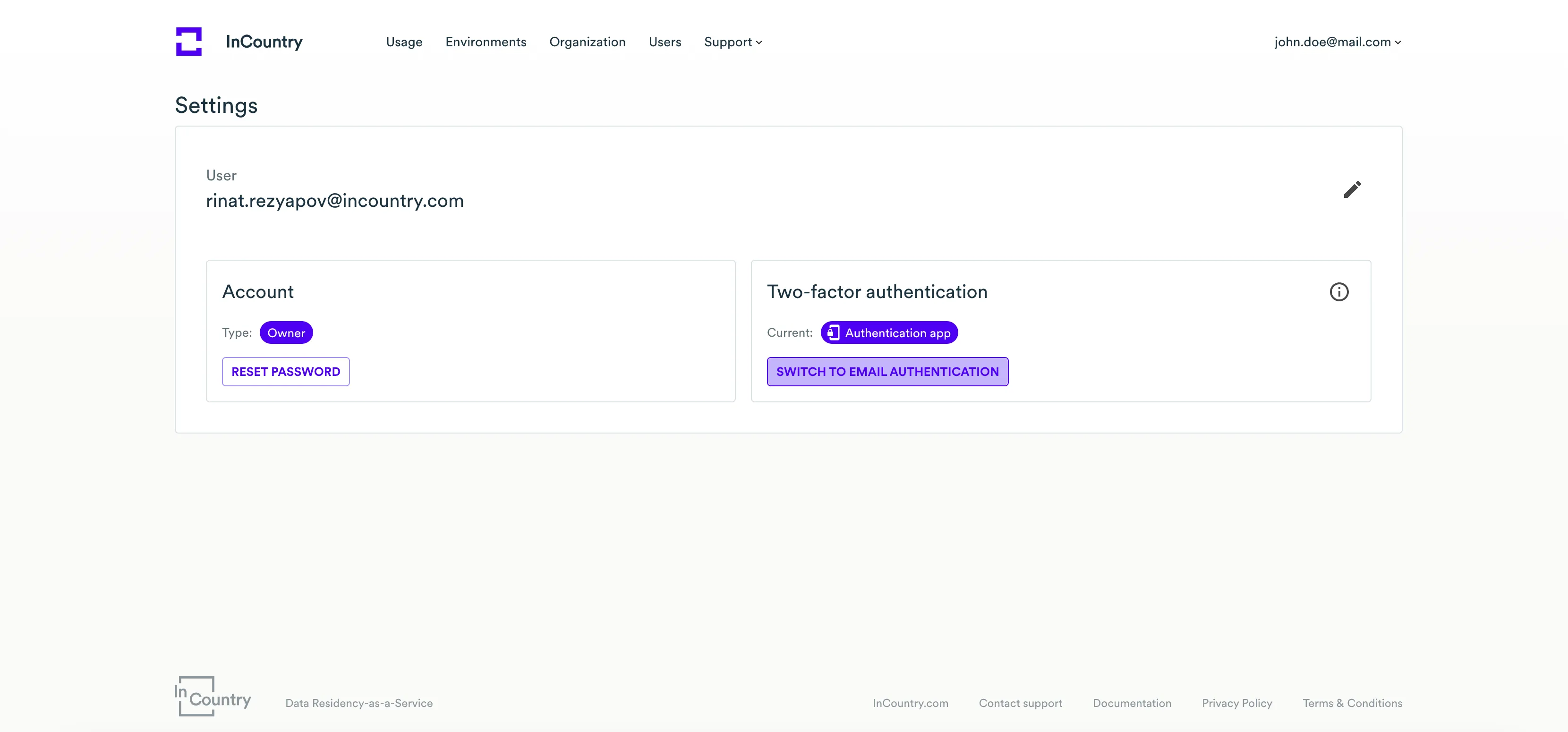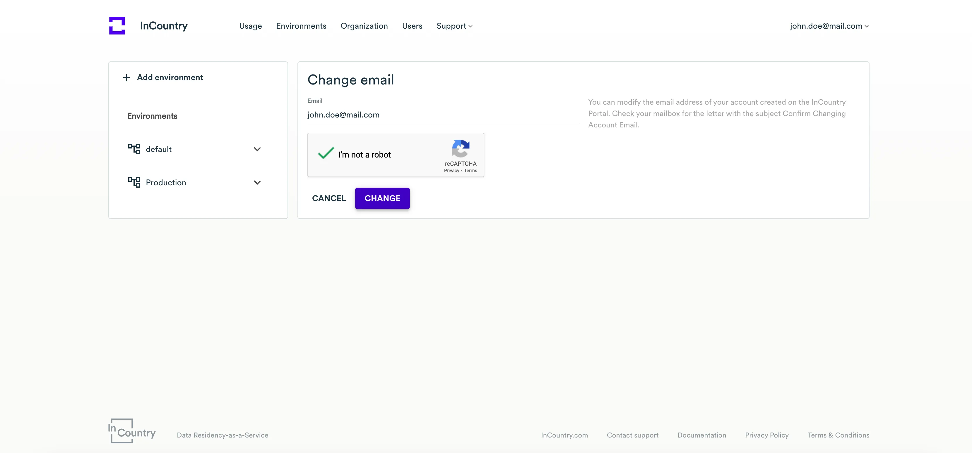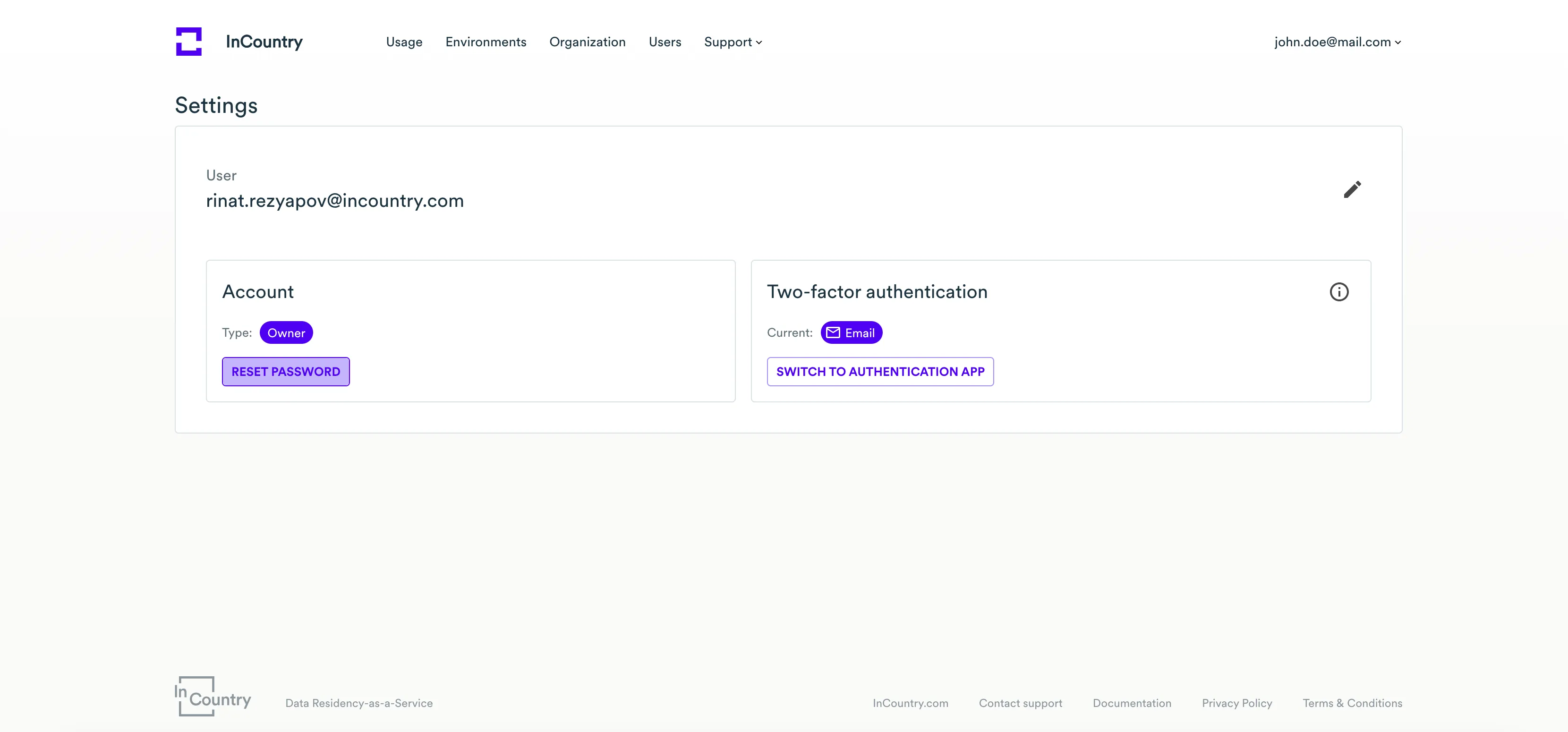 According to security requirements, your password of the user account expires every 90 days. You may need to reset it in order to further log in to the InCountry Portal. For the details on this, see Resetting the password