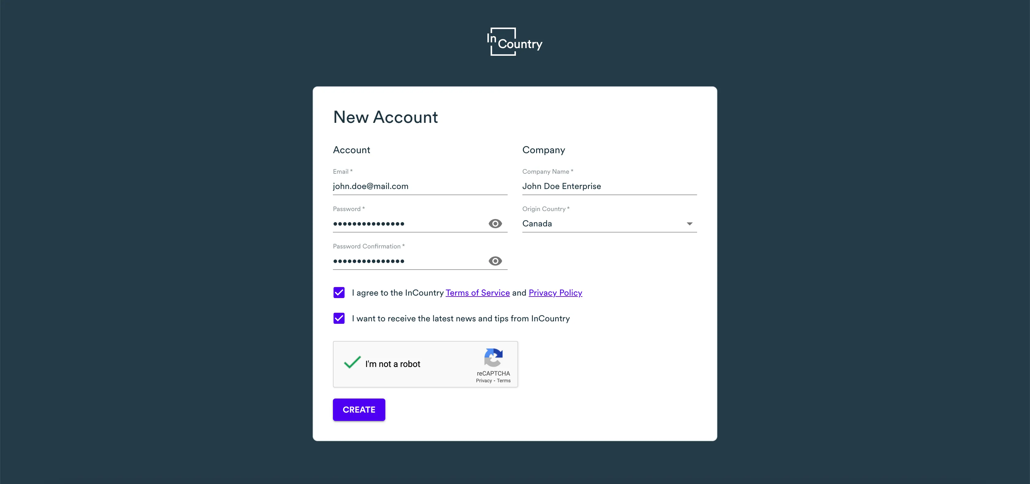 Move the toggle right to indicate that you agree to the InCountry Terms of Service. Account creation is not possible without accepting the terms of service.