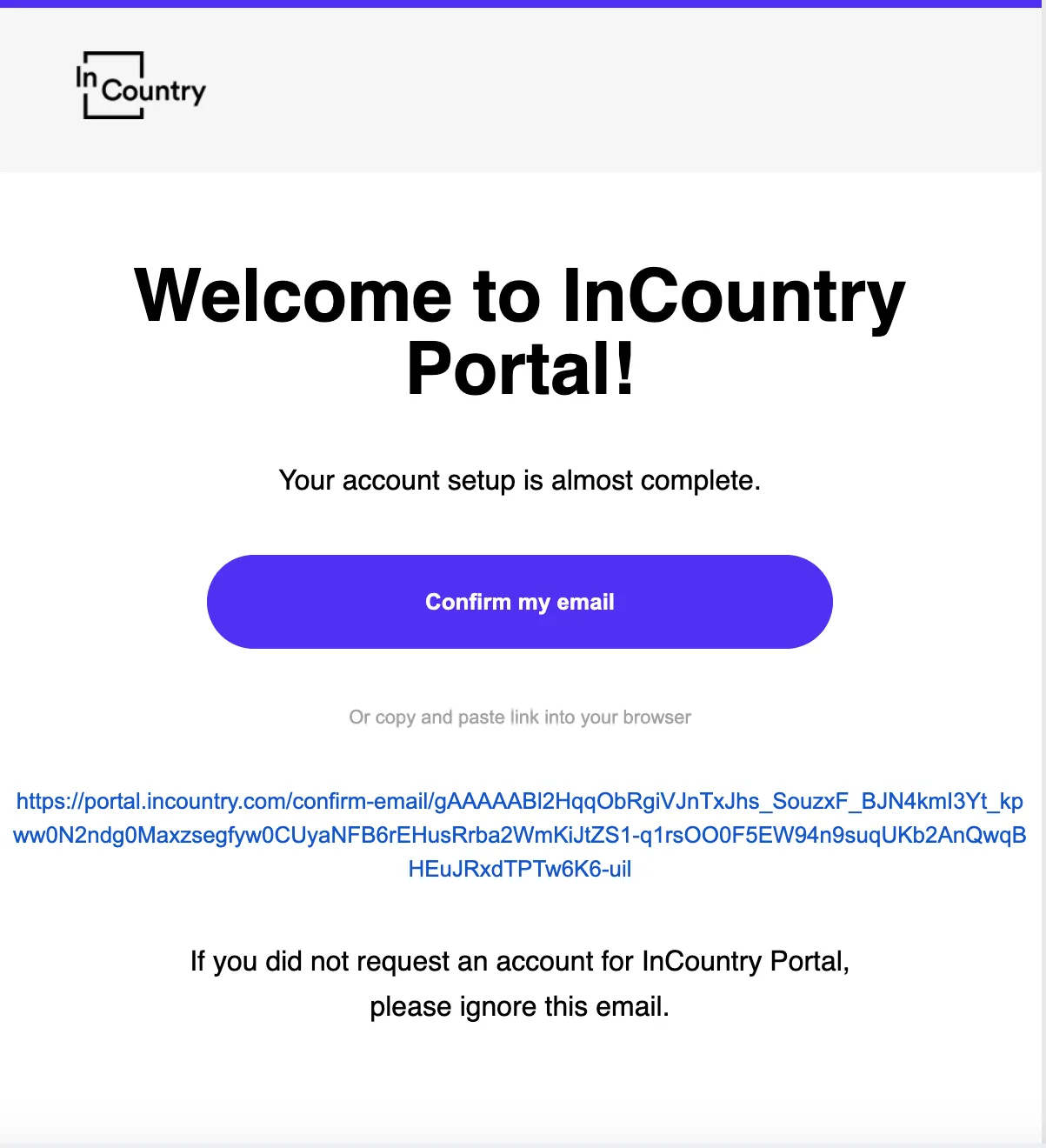 Follow the instructions in the confirmation email to confirm your email address and further sign in to the InCountry Portal and start using the data residency services.