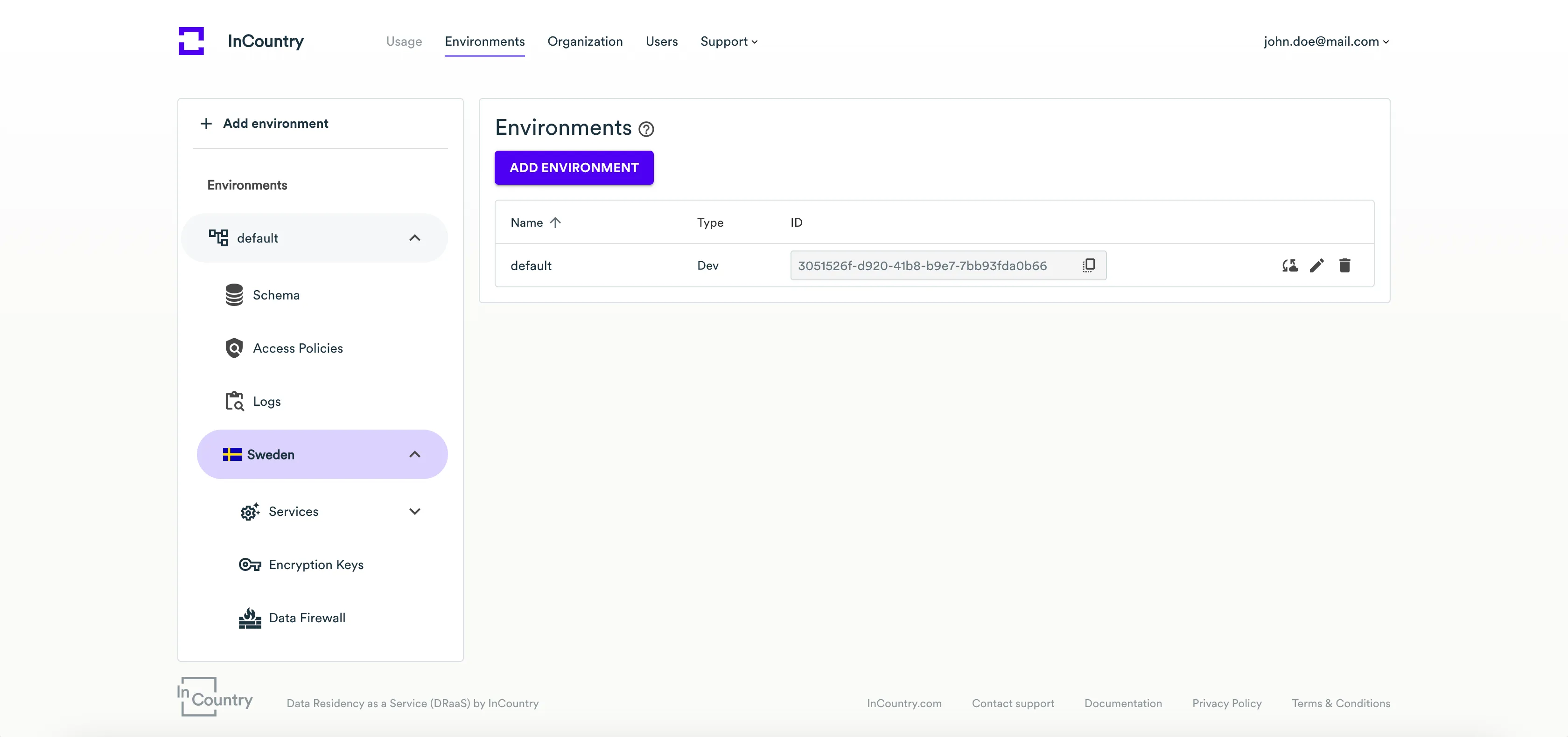 | Environments | Provides the functionality to manage environments, Storage credentials, services, and encryption keys that you need to that are required for getting access to data residency services provided by InCountry. |