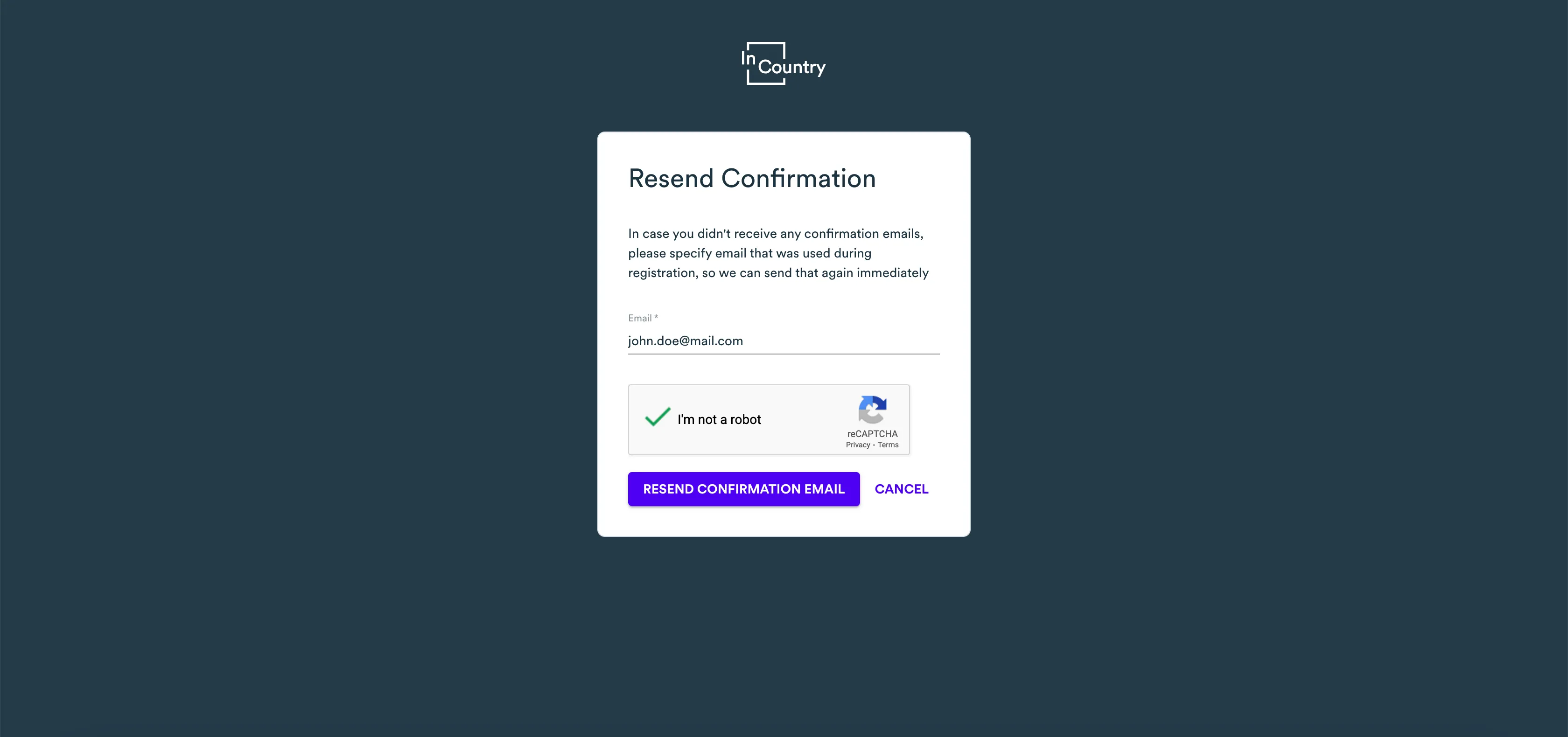 In the Resend Confirmation form, enter the email address you used to sign up to the InCountry Portal.