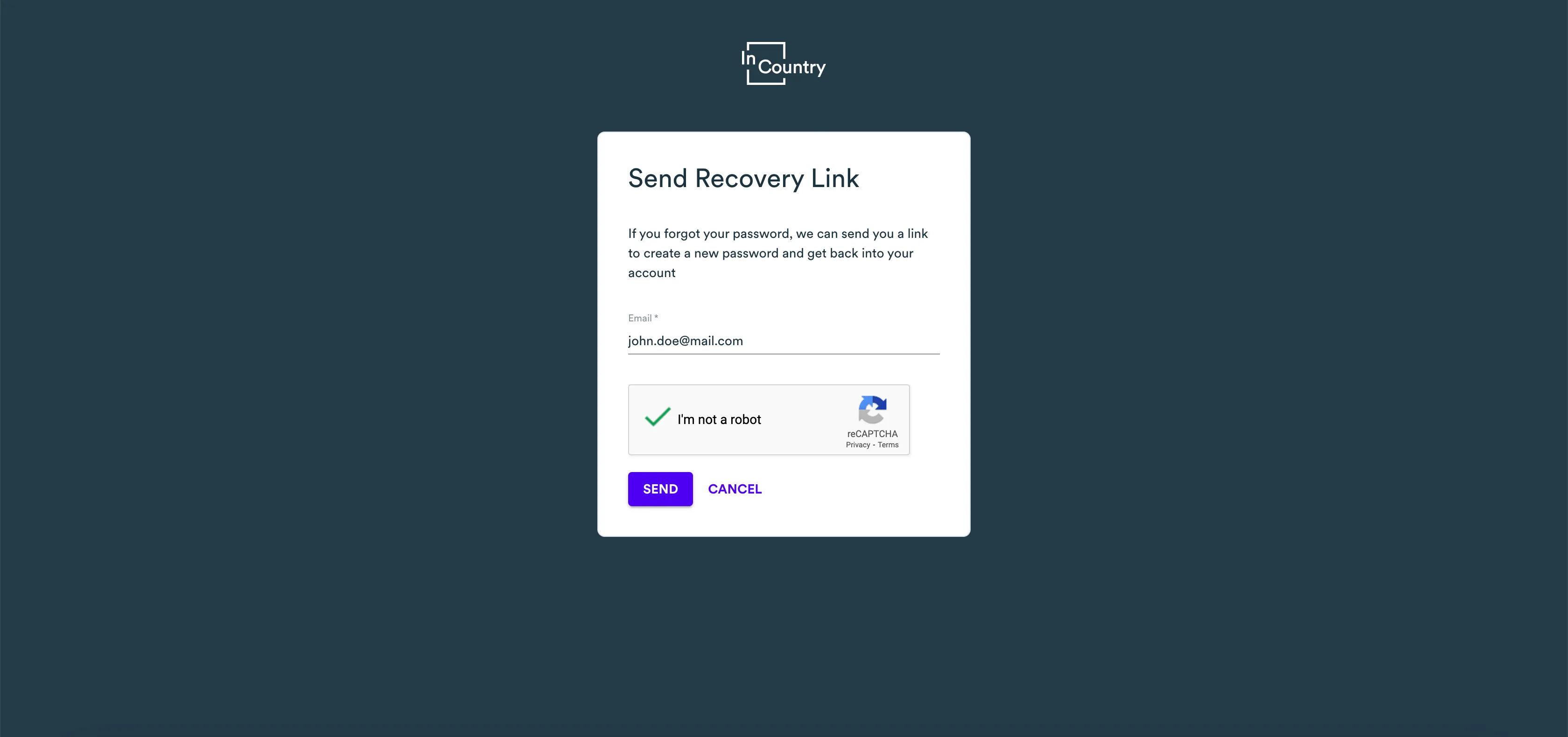 In the Send Recovery Link form, enter the email address you used to sign up to the InCountry Portal.