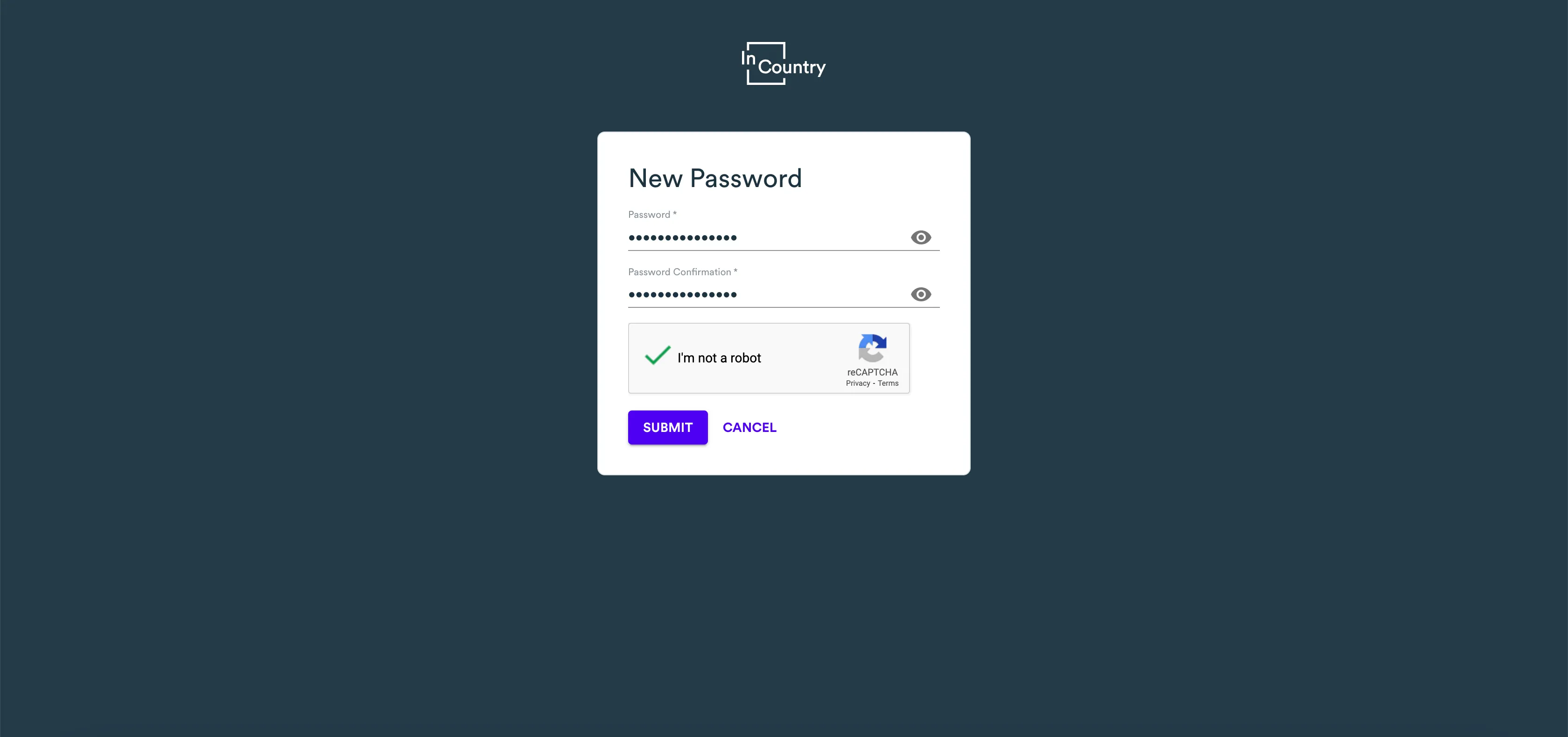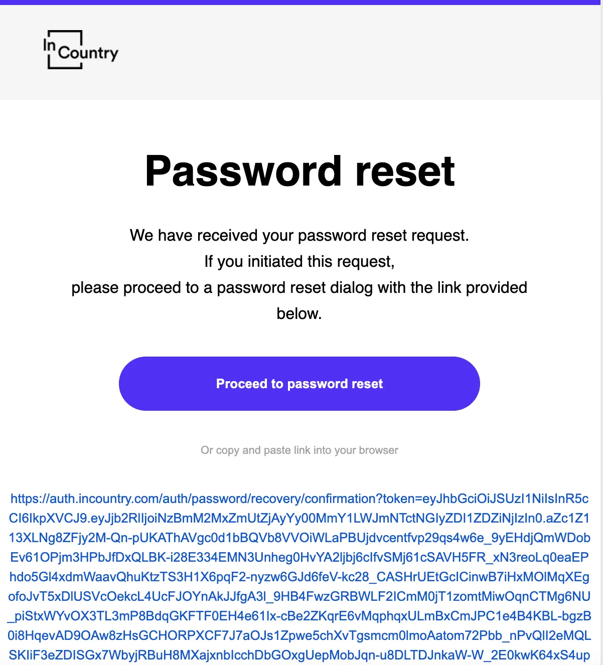 Open your mailbox and check it for the confirmation email with the subject InCountry - Password Reset.