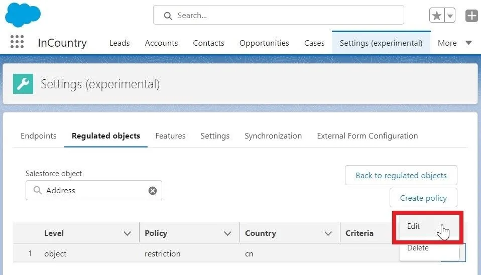 Select the Salesforce object which data regulation policy you want to edit.