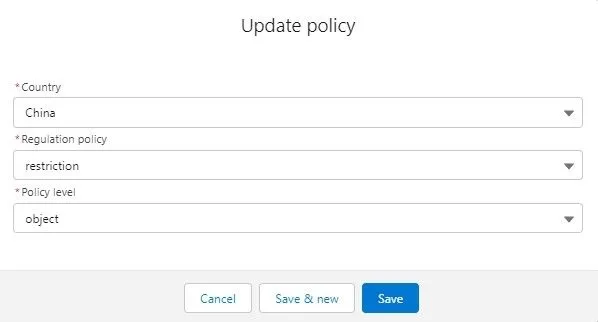 | Object-level | This configuration is used when some objects within your Salesforce instance are attributed to one country, while the others are attributed to another one, for example, Account > US, Contact > RU. This configuration if overridden by the record-level configuration. |