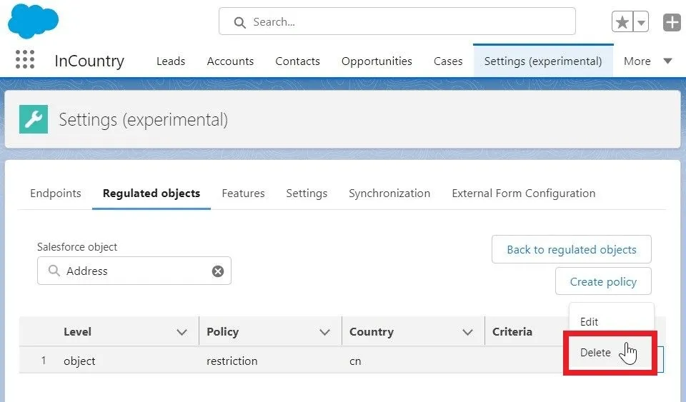 Select the Salesforce object which data regulation policy you want to delete.