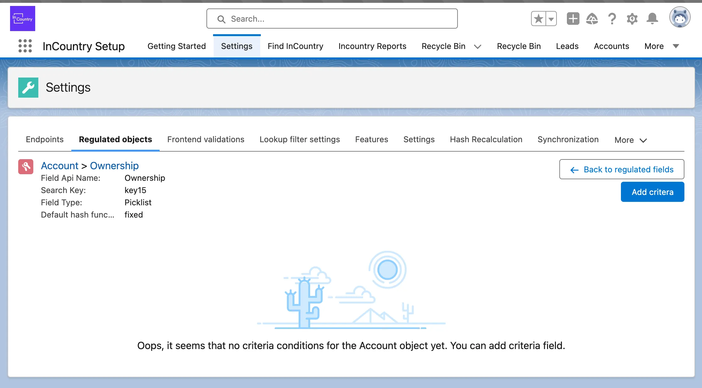 A new row action "Manage Criteria" has been added to the page for viewing regulated objects and fields. This action is available at the end of each row in the table.