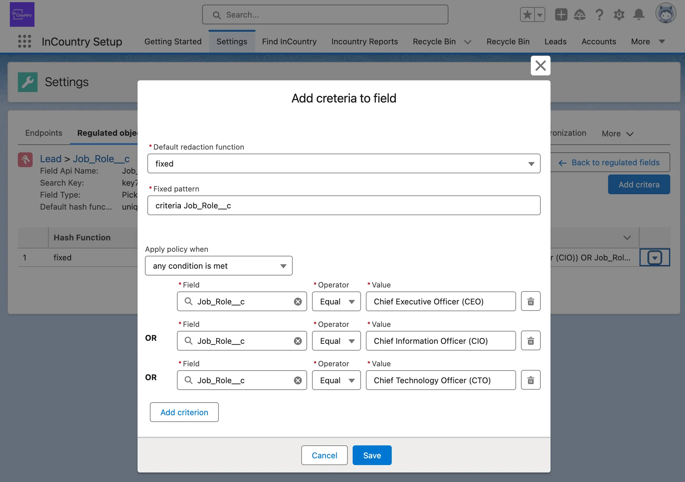 Field Criteria is a feature that allows you to set detailed rules for redacting regulated fields from the "Setting > Regulated Objects" menu. Specifically, it defines which redaction function will be applied to a field based on the values of fields in the record.