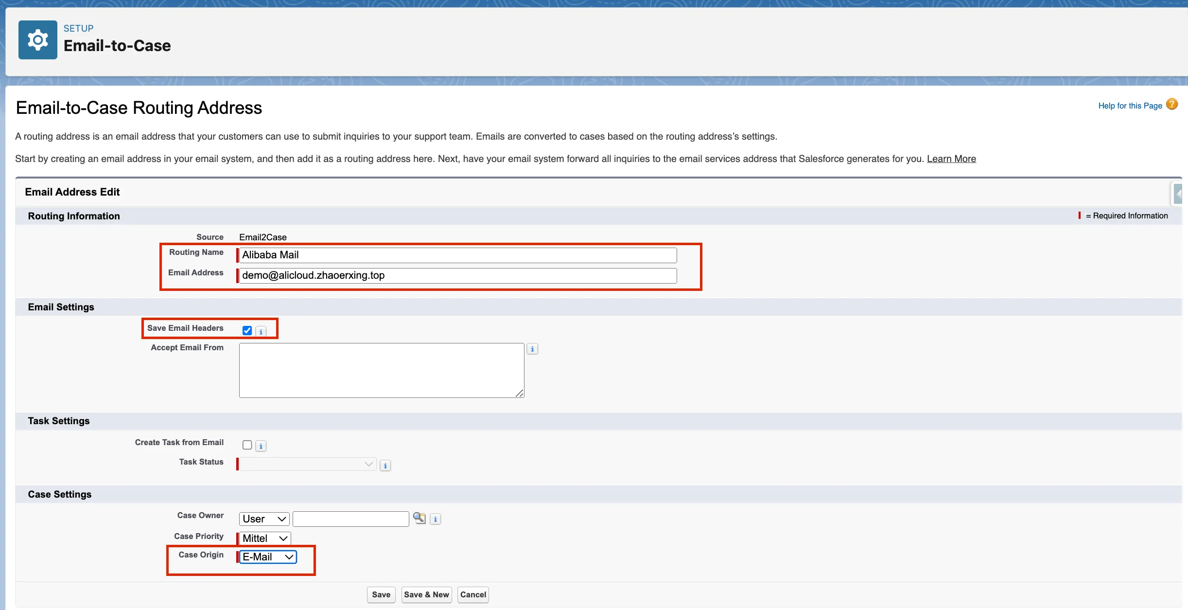 Email Address - enter the inbound email address for this Email-to-Case routing address. Emails from this address will be routed to the allocated Salesforce email address for converting emails into cases.