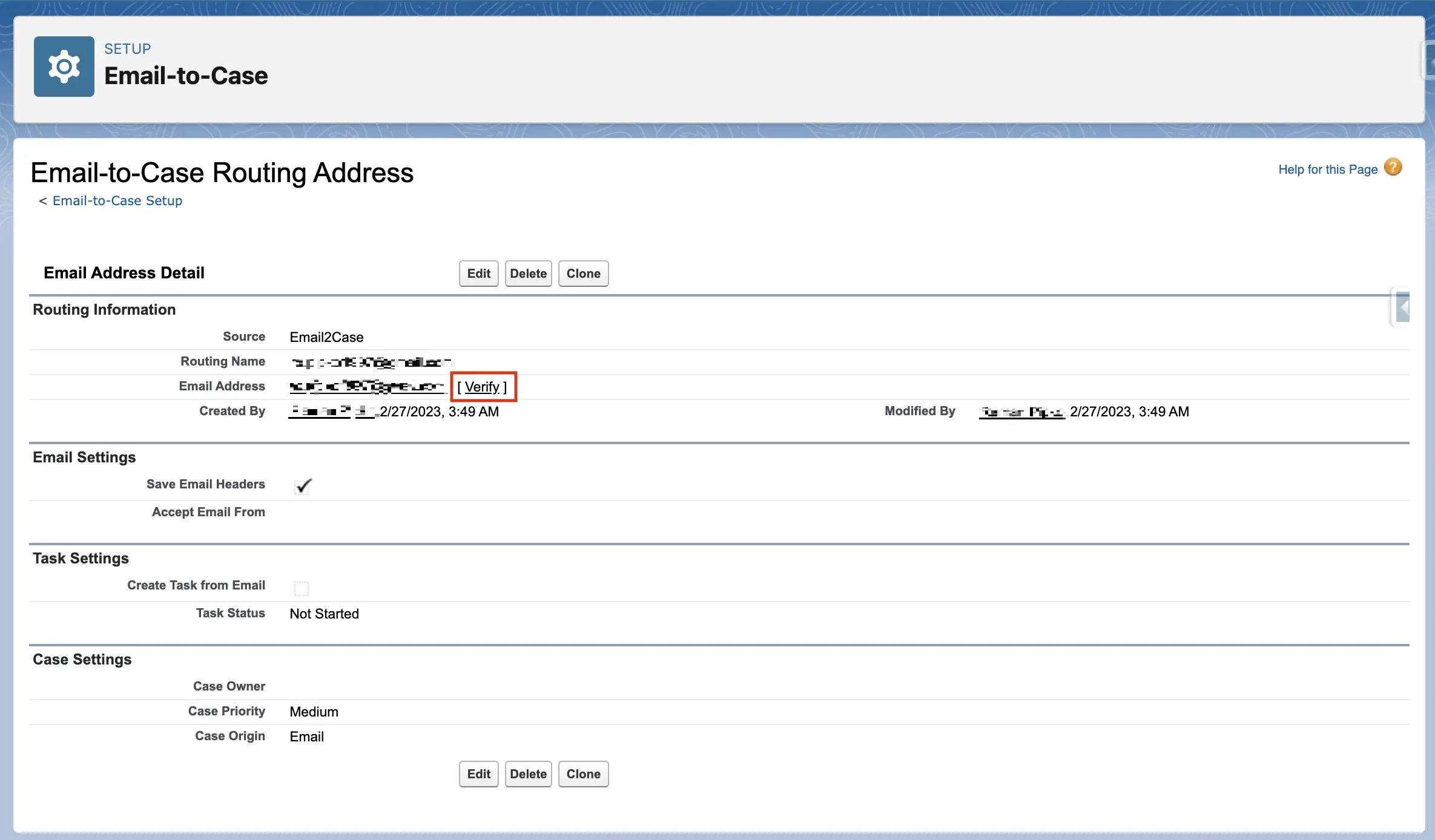 On the Email-to-Case Routing Address page, locate the email address and click Verify.