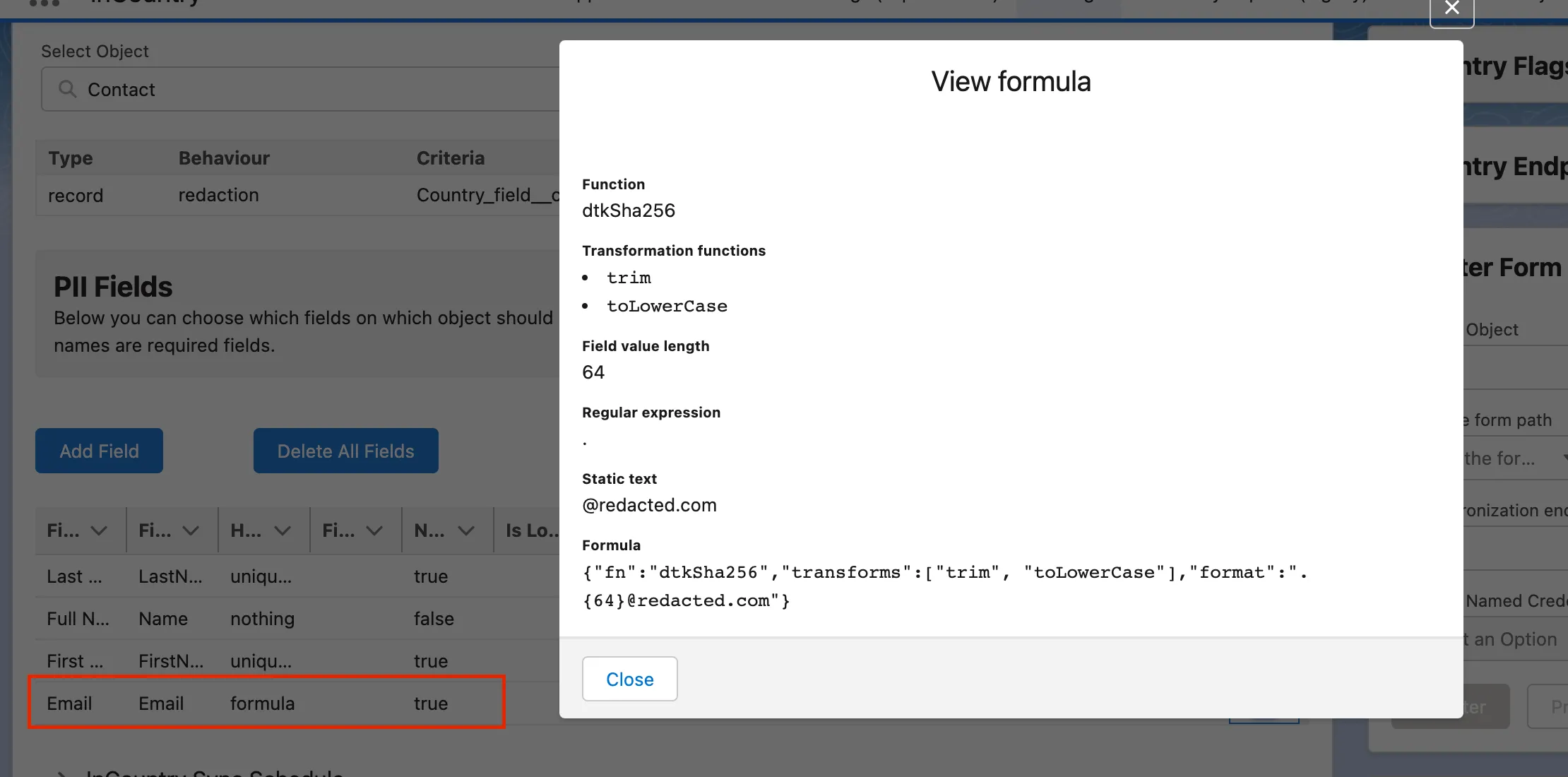 Field Hash function Searchable Email formula{"fn":"dtkSha256","transforms":["trim", "toLowerCase"],"format":".{64}@redacted.com"}