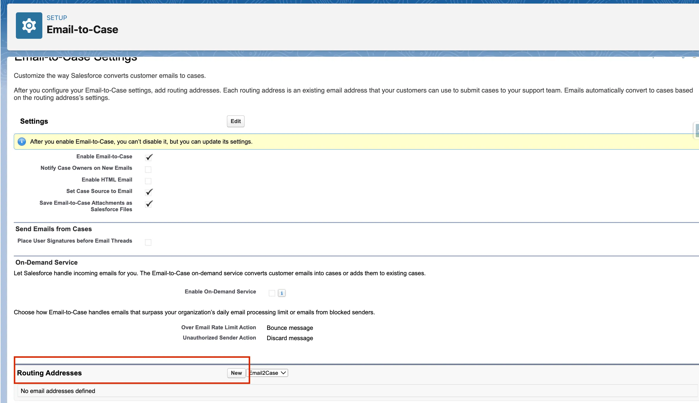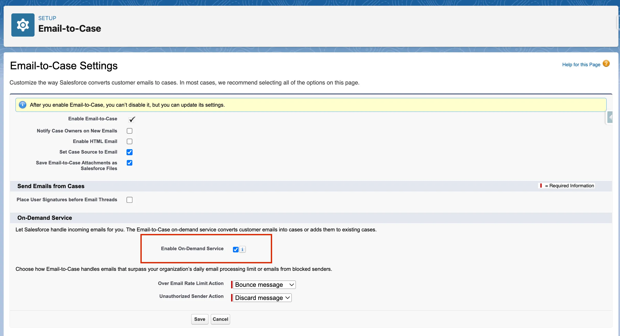 Check the Enable On-Demand Service box to activate the Email-to-Case feature.