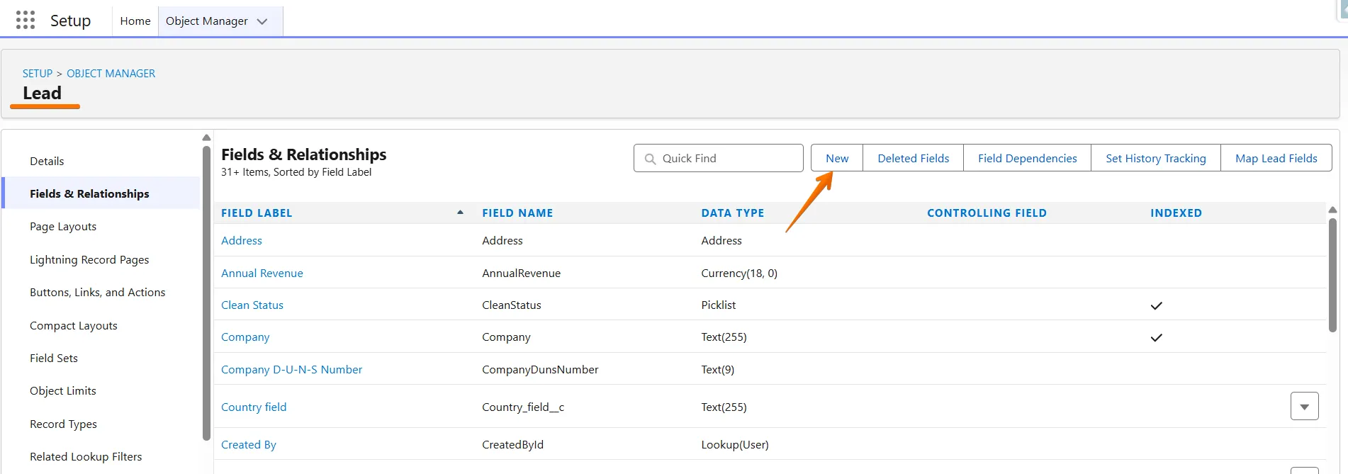 Click the Gear Icon > Setup > Object Manager, select Lead or Contact, and click New to add a new field.