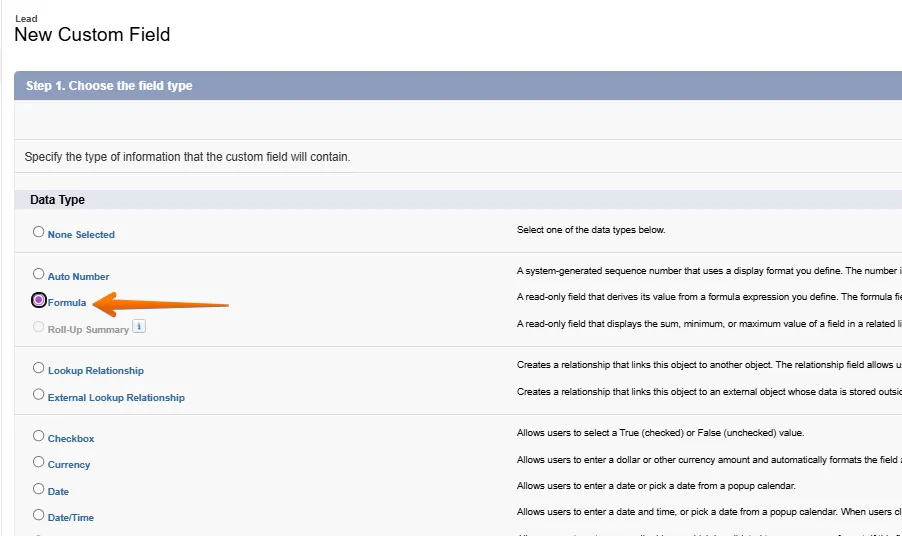 Select the field Data Type > Formula, then click Next.