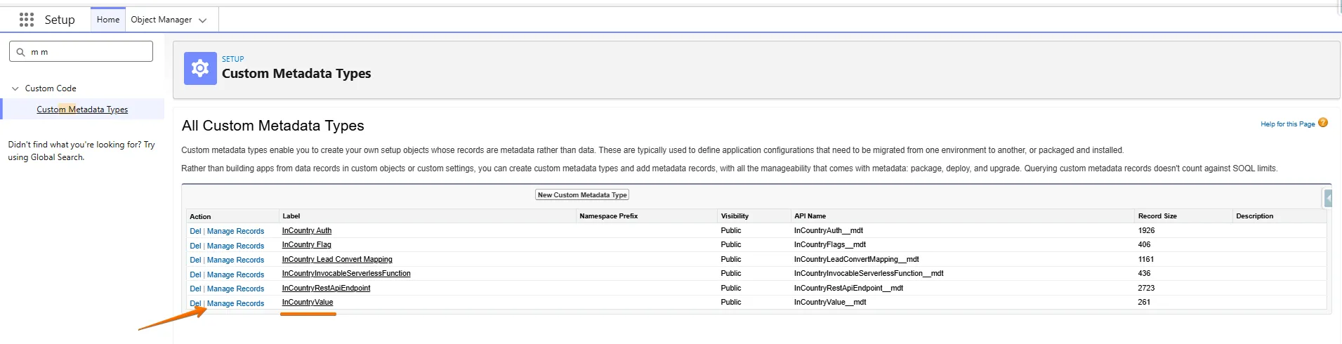 Then, go to Custom Metadata Types, select InCountryValue, click Manage Records, and then click New to create a new value.