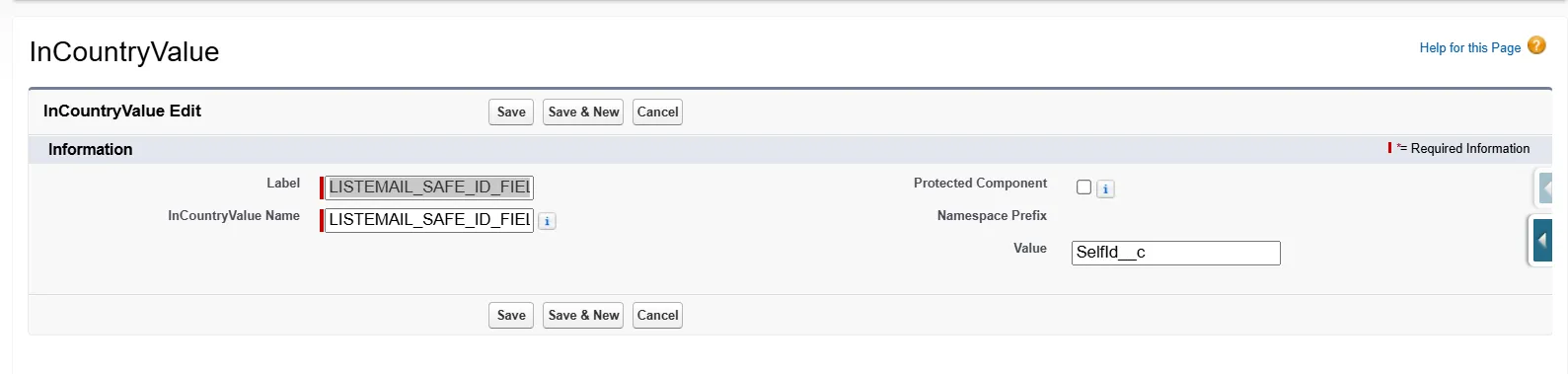 LISTEMAIL_SAFE_ID_FIELD_NAME'; for the InCountryValue Name, also enter 'LISTEMAIL_SAFE_ID_FIELD_NAME'. In the Value field, enter the formula field name you created earlier (e.g.,SelfIdField__c). Then click Save.