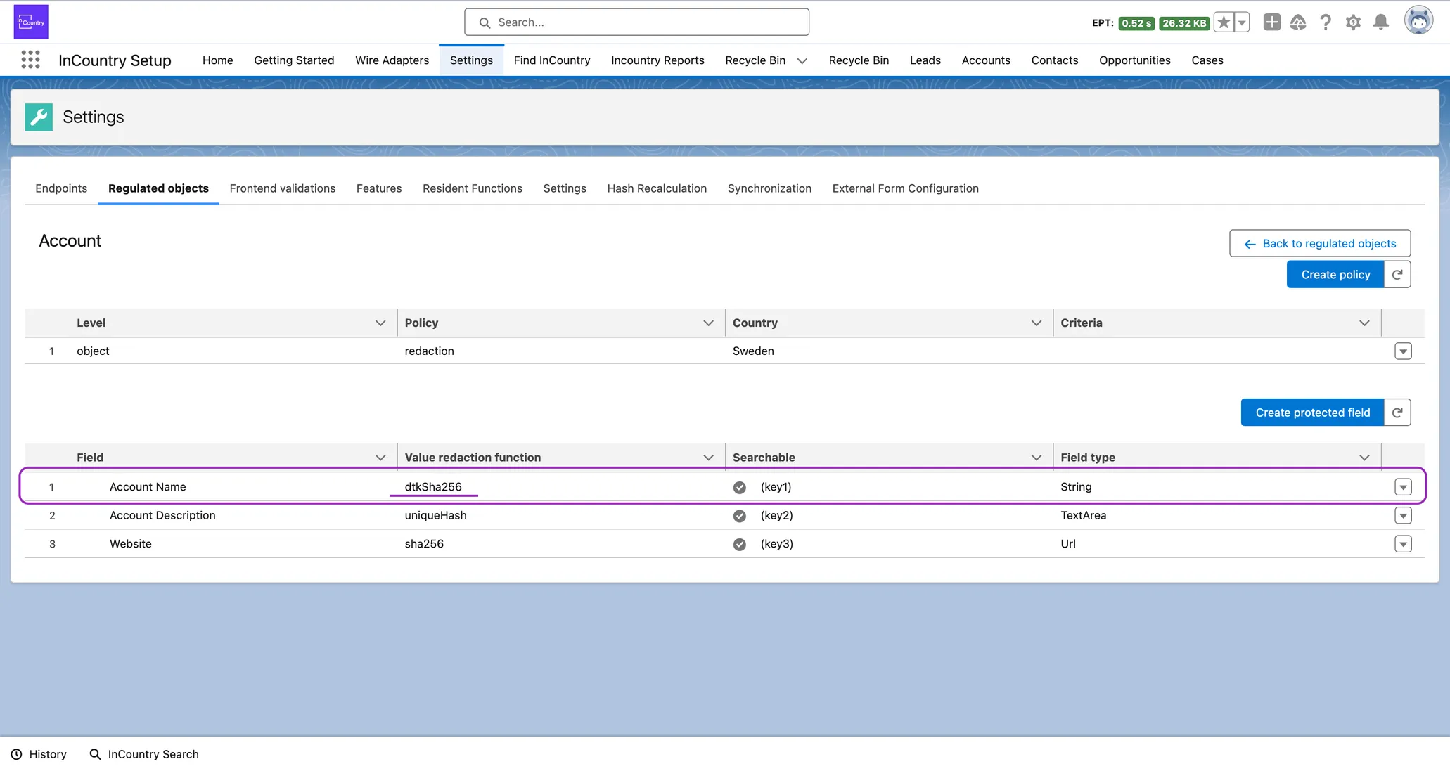 Configure the policy and protected fields for the necessary object by using the hash function [dtkSha256, formula].