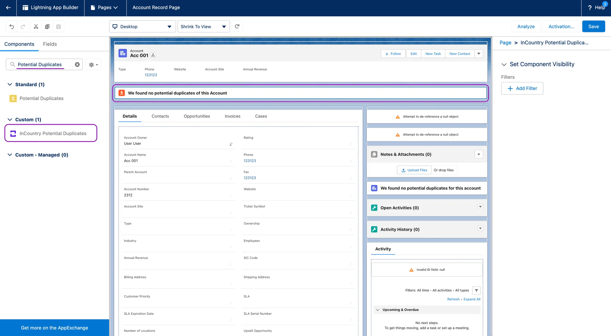 Add a custom InCountry Potential Duplicates component to the Lightning App Builder.