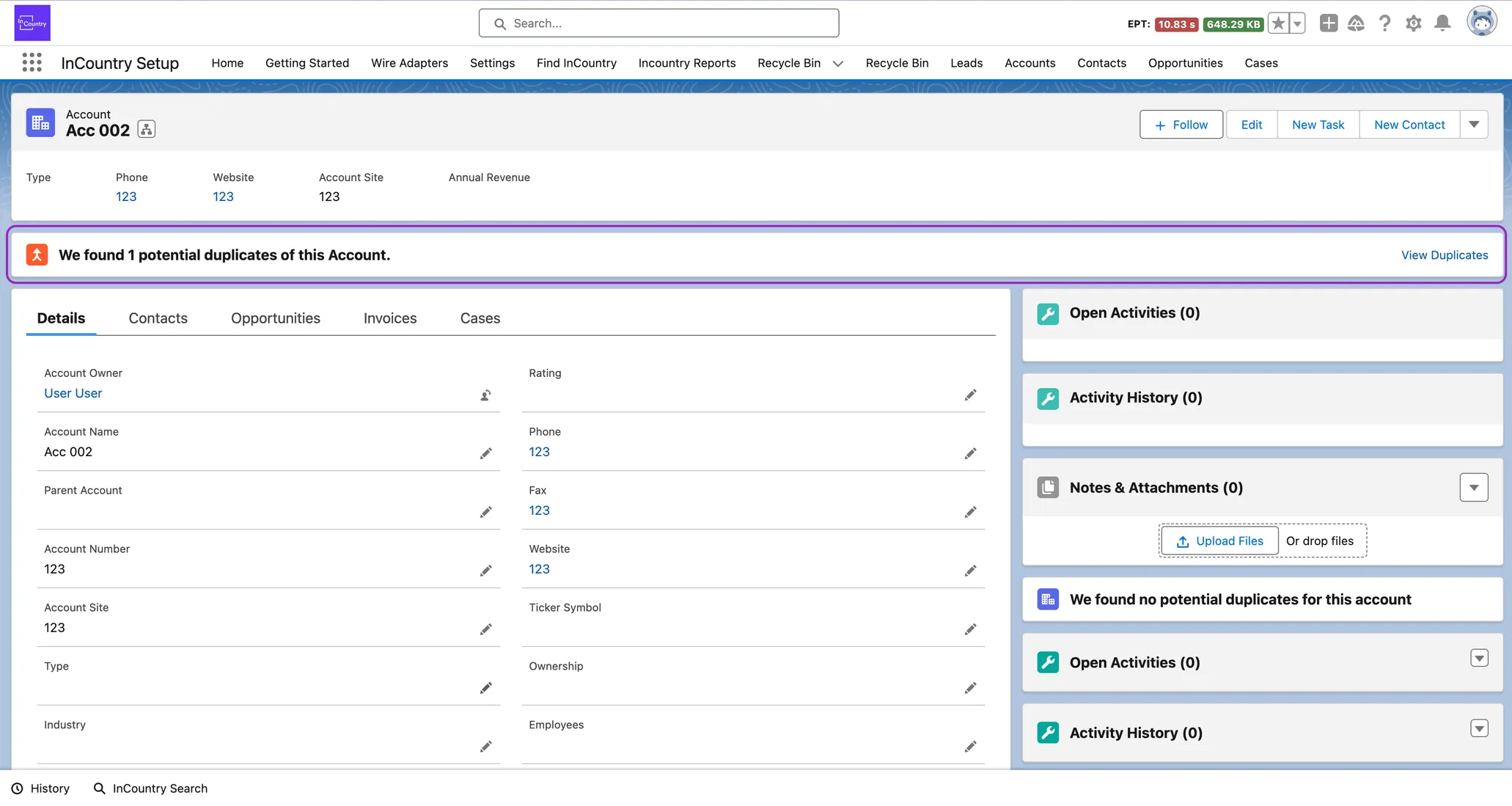 The InCountry Potential Duplicates component is displayed in the record details view only.
