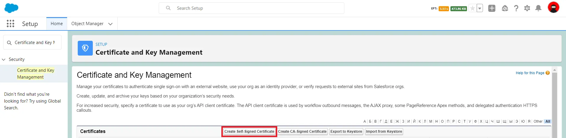 On the Certificate and Key Management page, click Create Self-Signed Certificate.