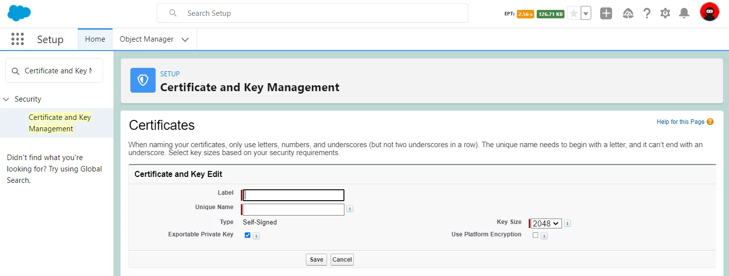 Enter a unique name. You can use the name that is automatically populated based on the certificate label you enter. This name can contain only underscores and alphanumeric characters, and must be unique in your Salesforce org. It must begin with a letter, not include spaces, not end with an underscore, and not contain two consecutive underscores. Use the unique name when referring to the certificate using Lightning Platform APIs or Apex.