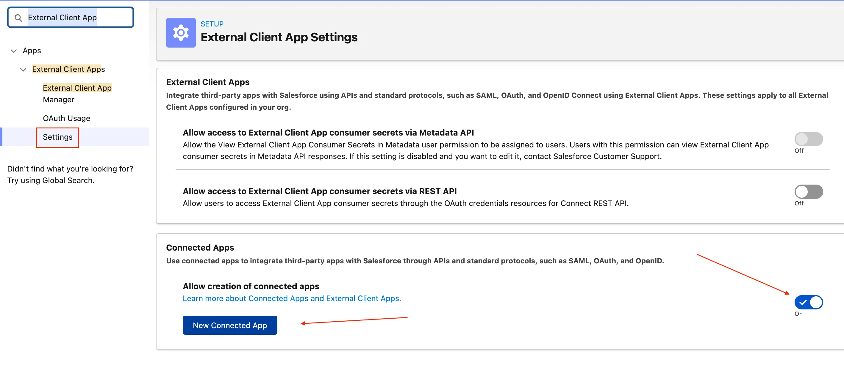 Go to Setup → Quick Find External Client App → Select Settings → Enable Connected Apps → Click New Connected App.