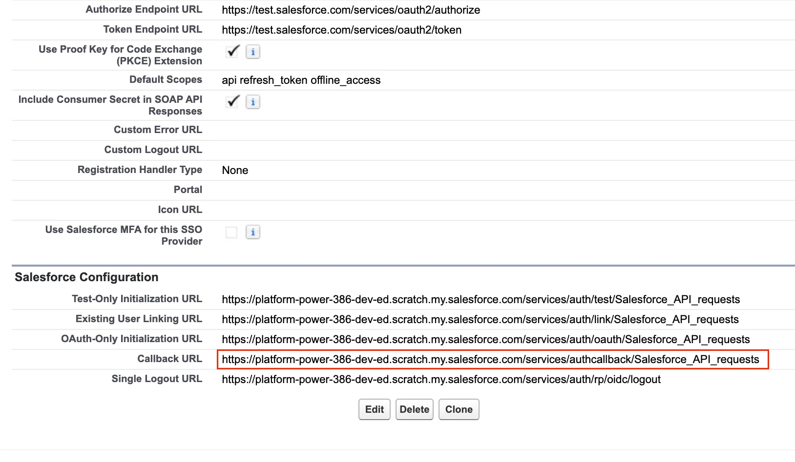 - Once the Auth. Provider is created, a set of new parameters will appear. Copy the Callback URL; you will need to use it in the Connected App setup.
