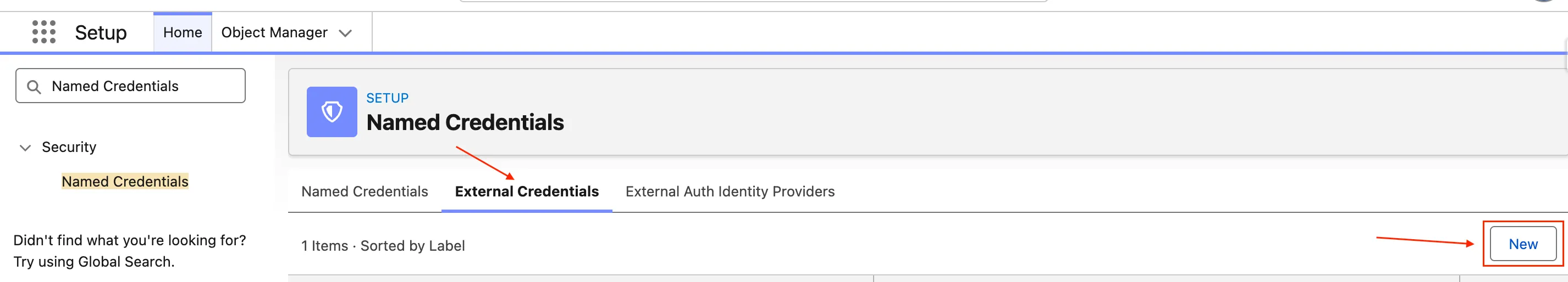 Go to Setup → Quick Find Named Credentials → Click External Credentials tab → Click New.