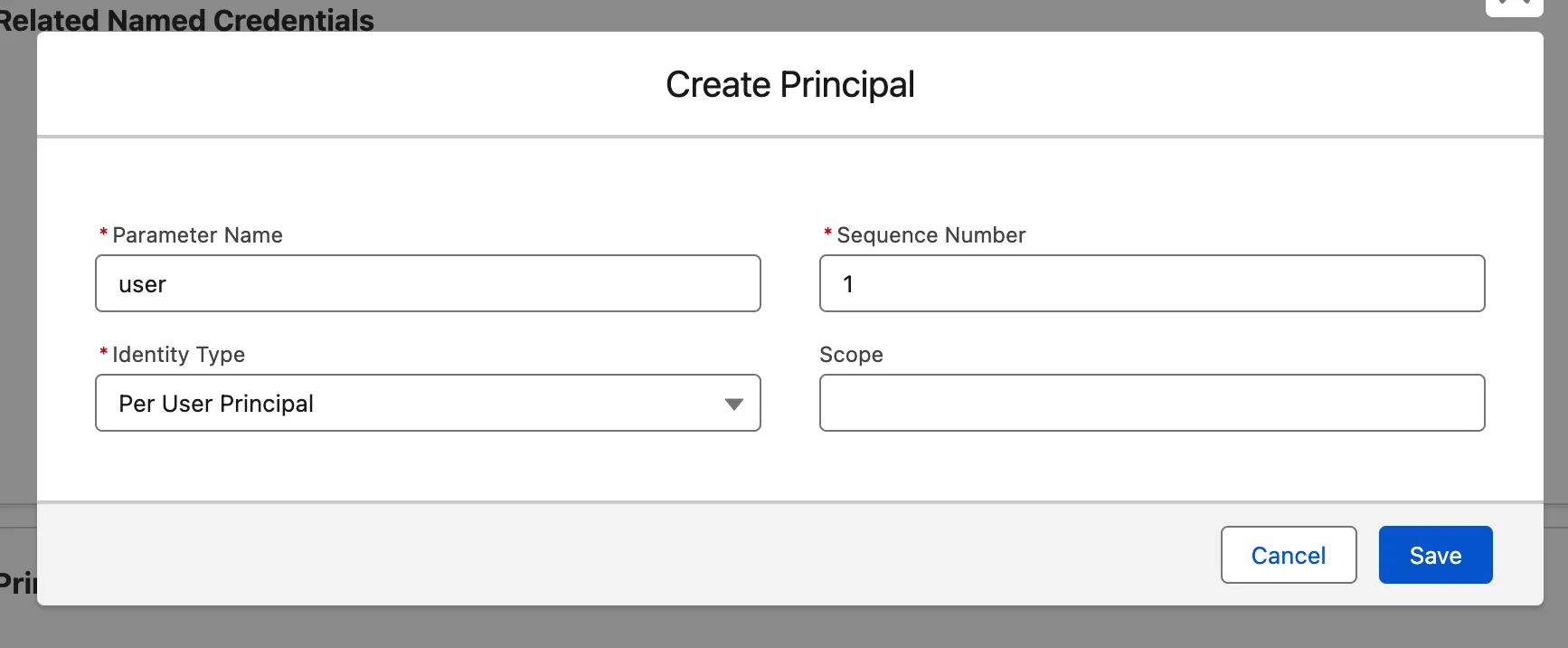 - Once the External Credential is created, navigate into it and set up a new Principal with these parameters: