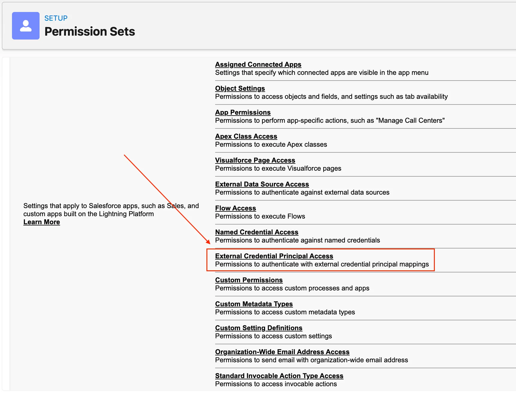 You will be redirected to the Permission Set details page. From there, click External Credential Principal Access.