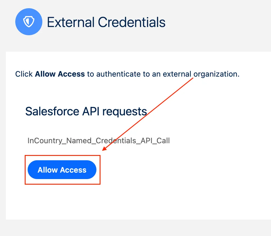 Once you assign the Permission Set, the user must complete the authorization flow. This step grants the necessary permission for the External Credential to make API calls and is required for every user who needs to use the InCountry package.