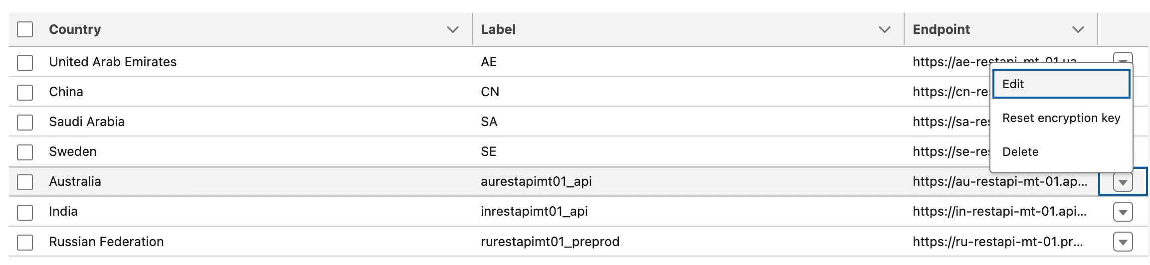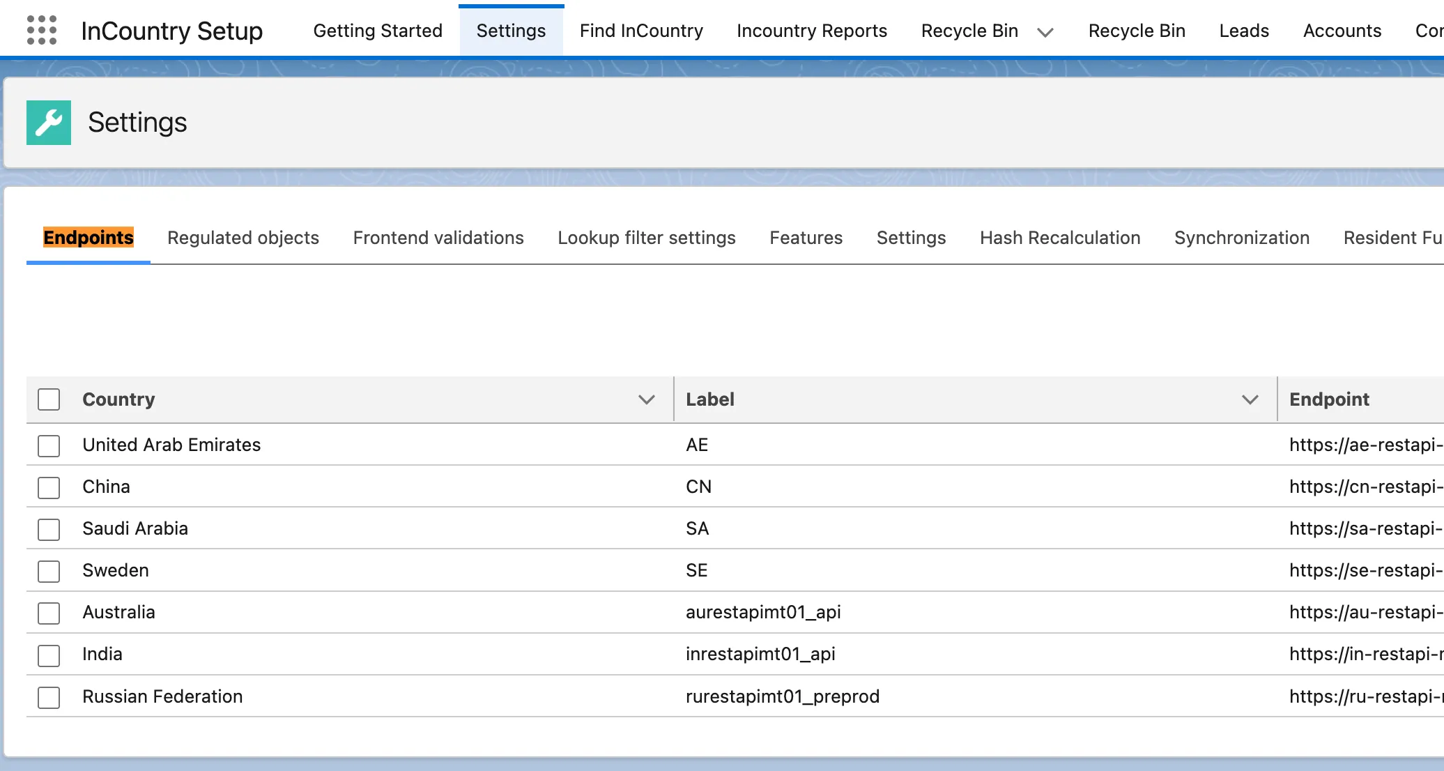 Go to App Launcher → InCountry Setup → Settings page → open Endpoints tab.