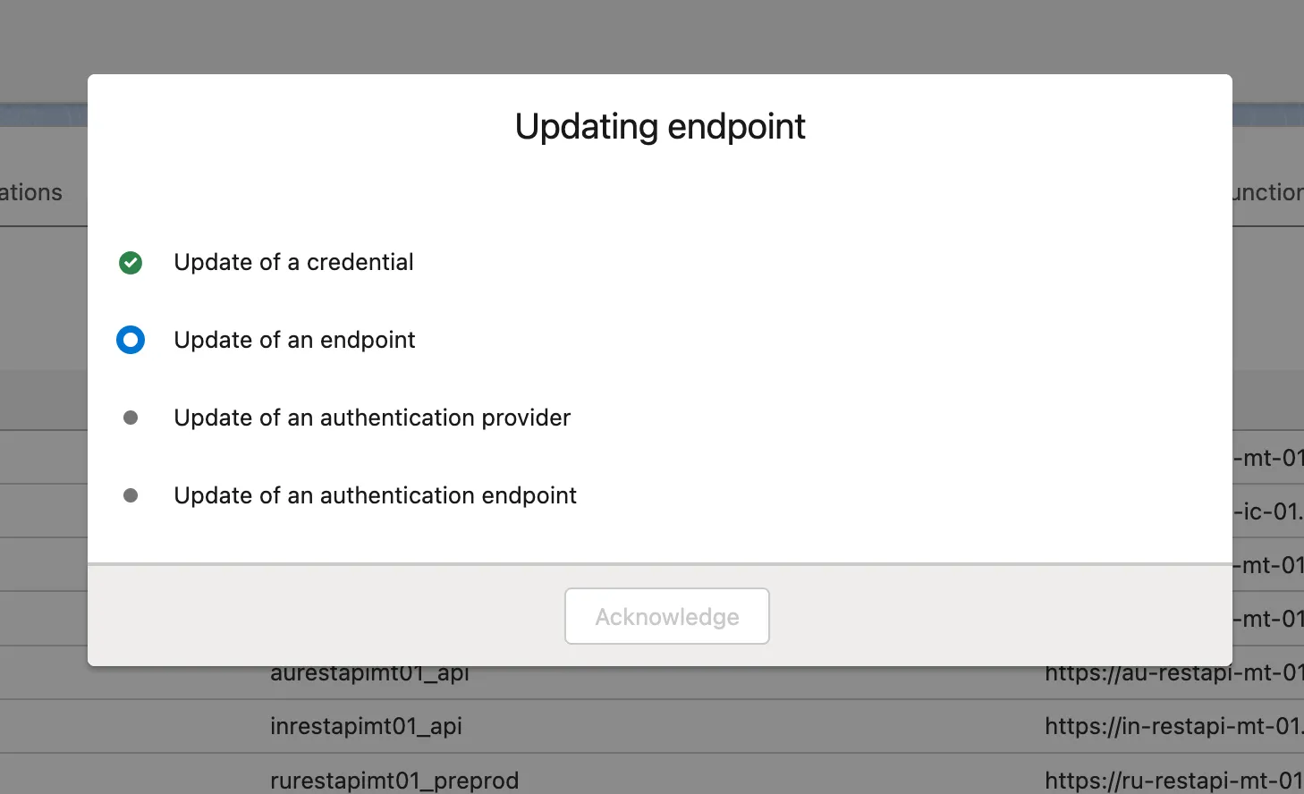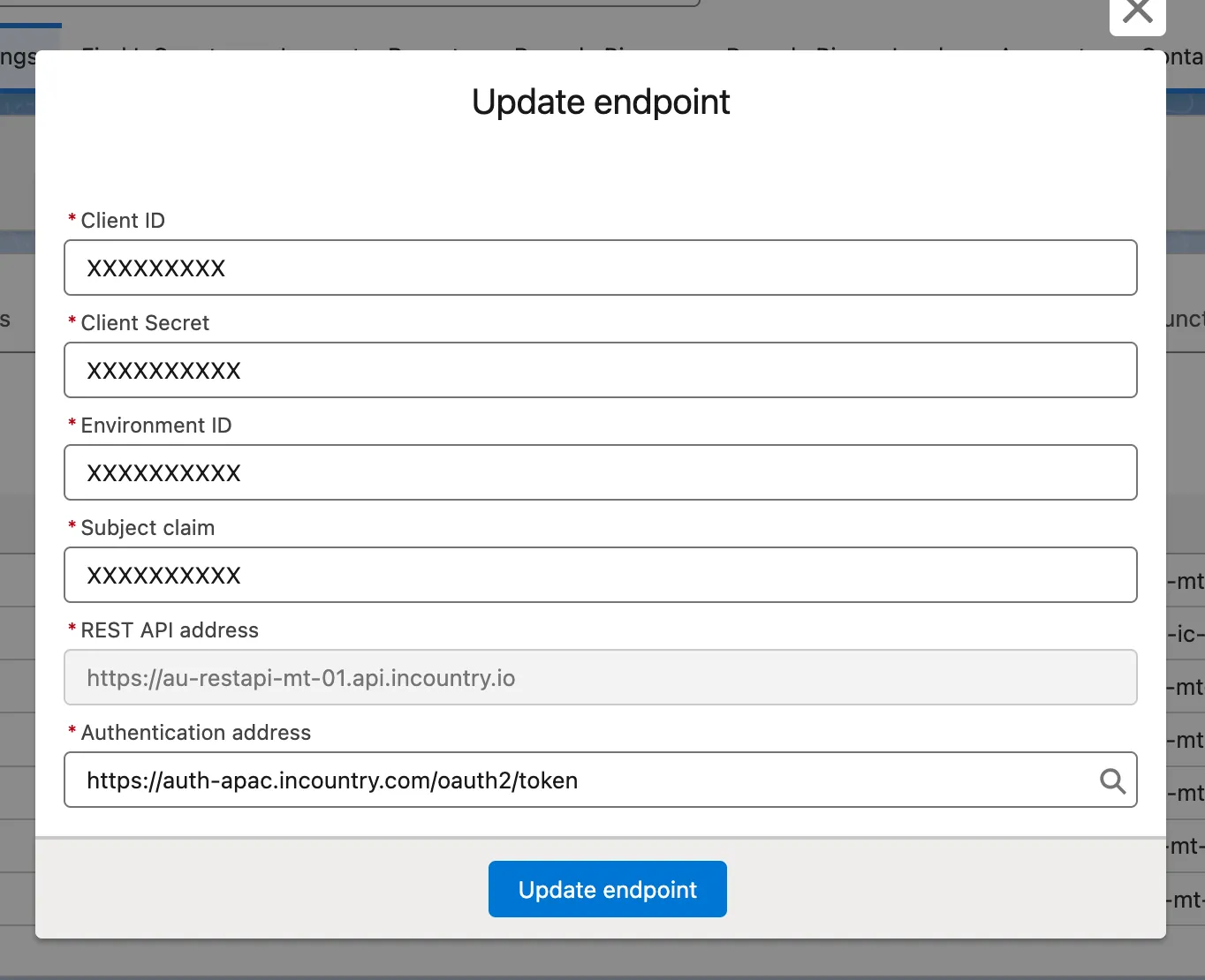 The resulting modal will display your InCountry credentials for that country. Here, you will see the difference from the previous credentials: the Client ID and Client Secret will be blank. Each time you update this credential, you will need to enter it from scratch.