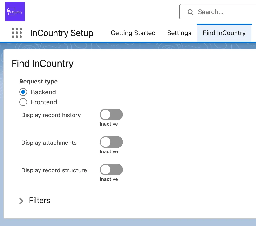 Go to App Launcher → InCountry Setup → Find InCountry page.