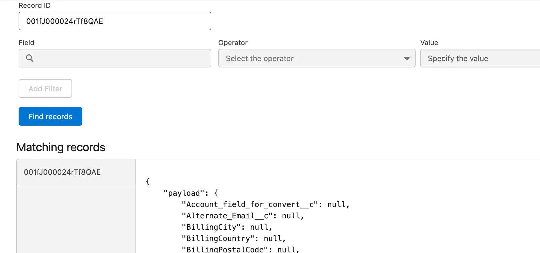 Success: If the credential is correct, the record data will display under the Matching Records section. Click on the Record ID in the displayed list to view the full record data and confirm successful retrieval.