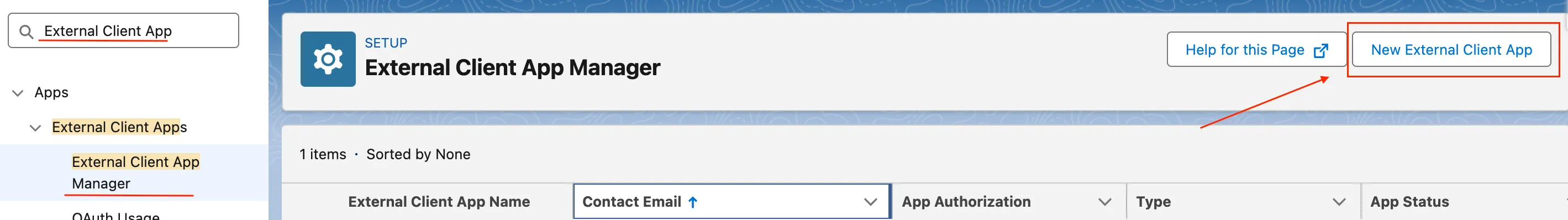 Go to Setup → Quick Find External Client App → External Client App Manager → Click New External Client App