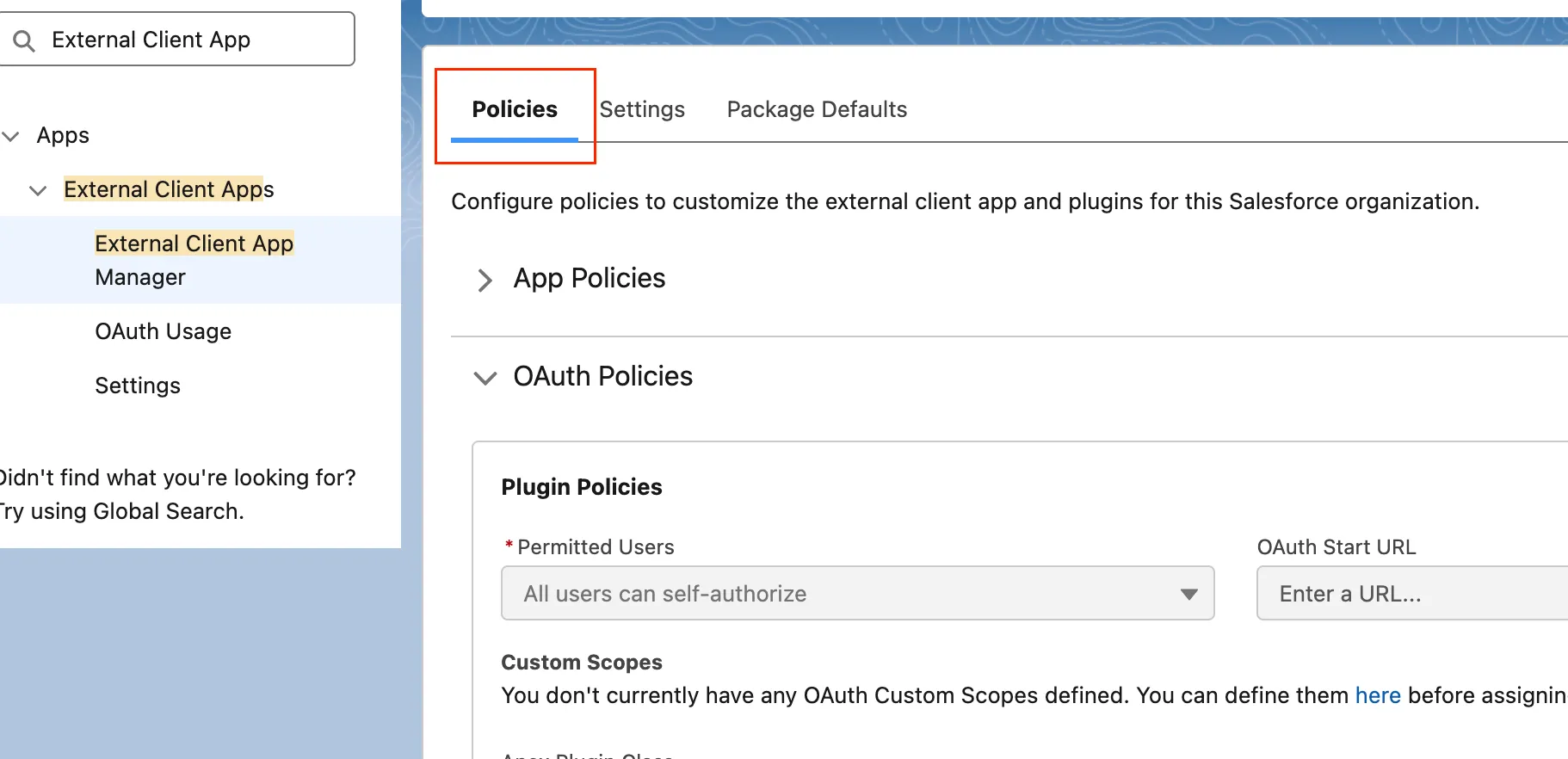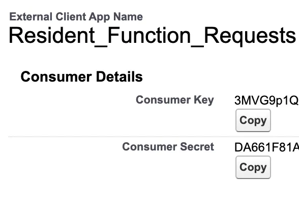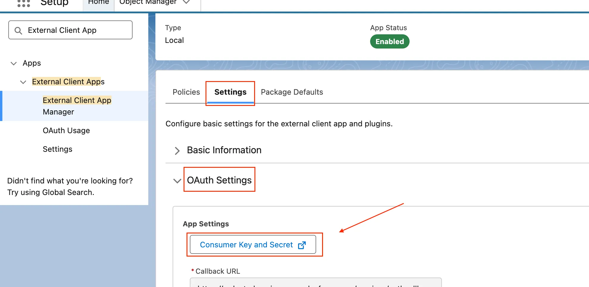 - Once the External Client App is created, go to Settings → OAuth Settings → App Settings → Consumer Key and Secret.