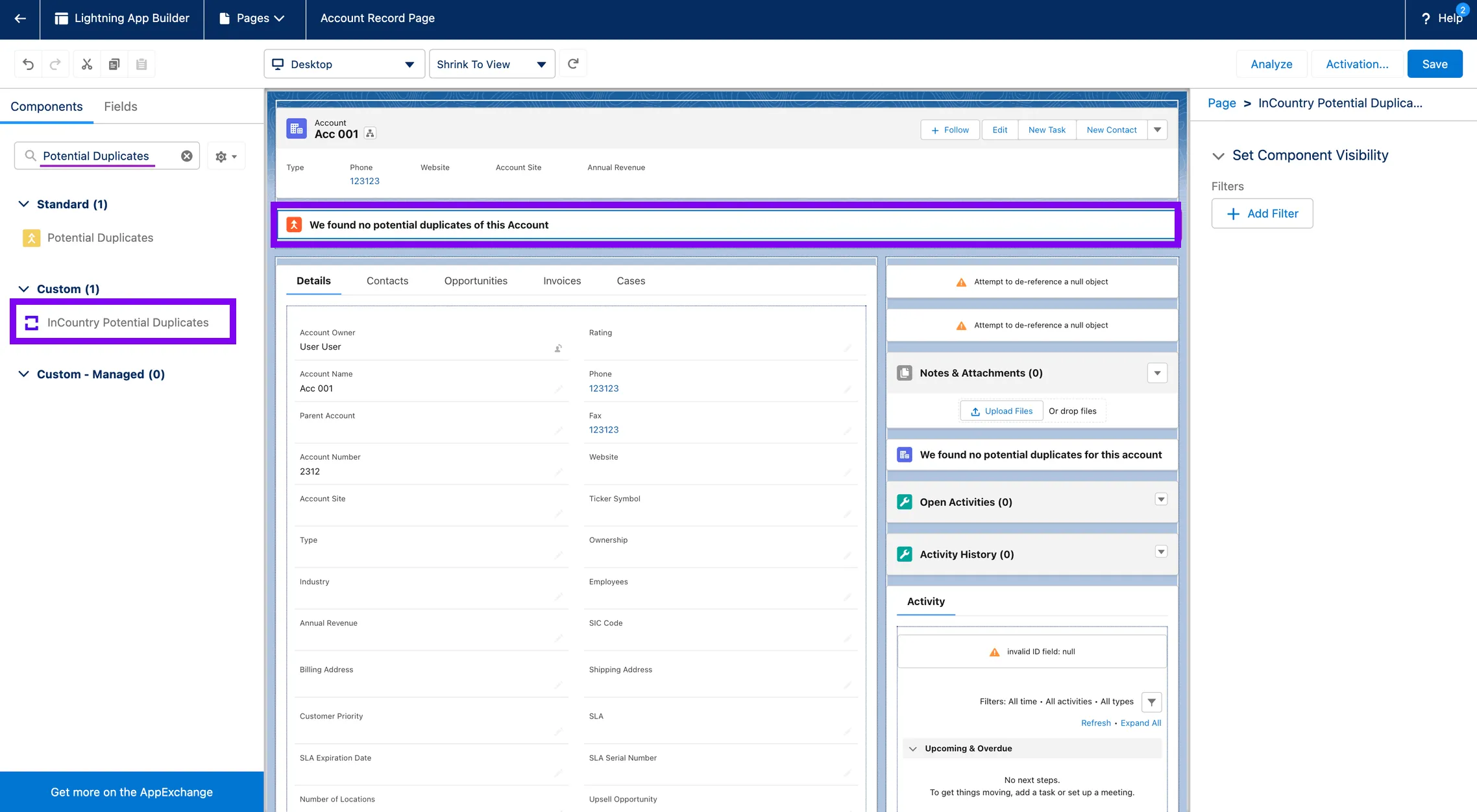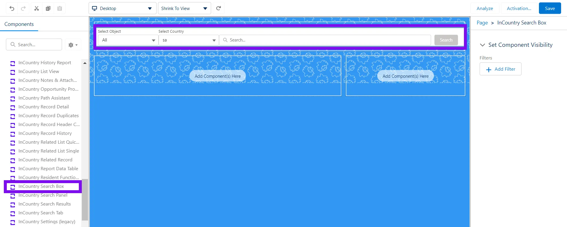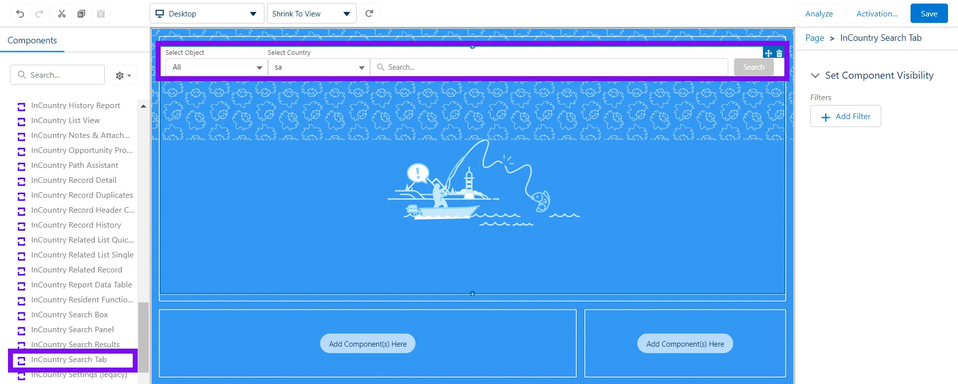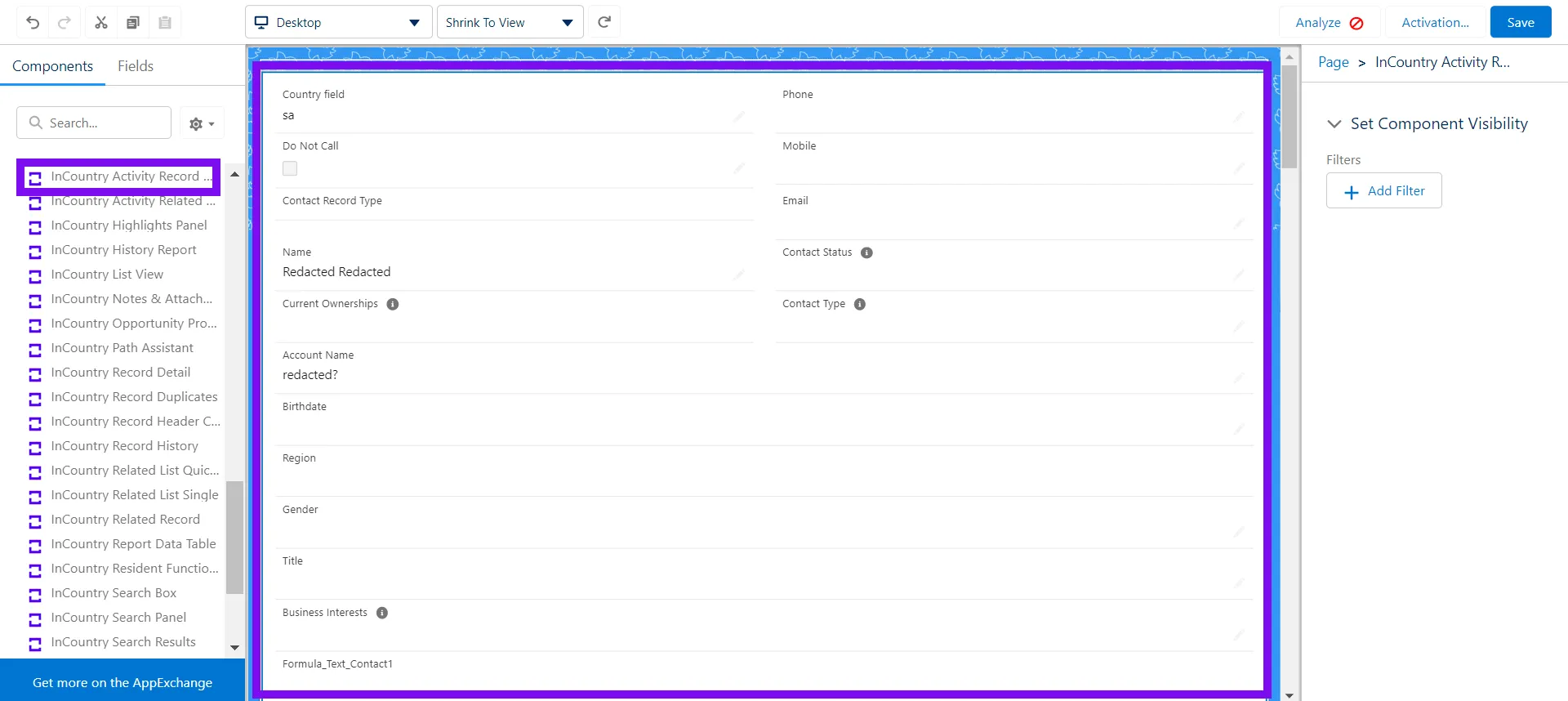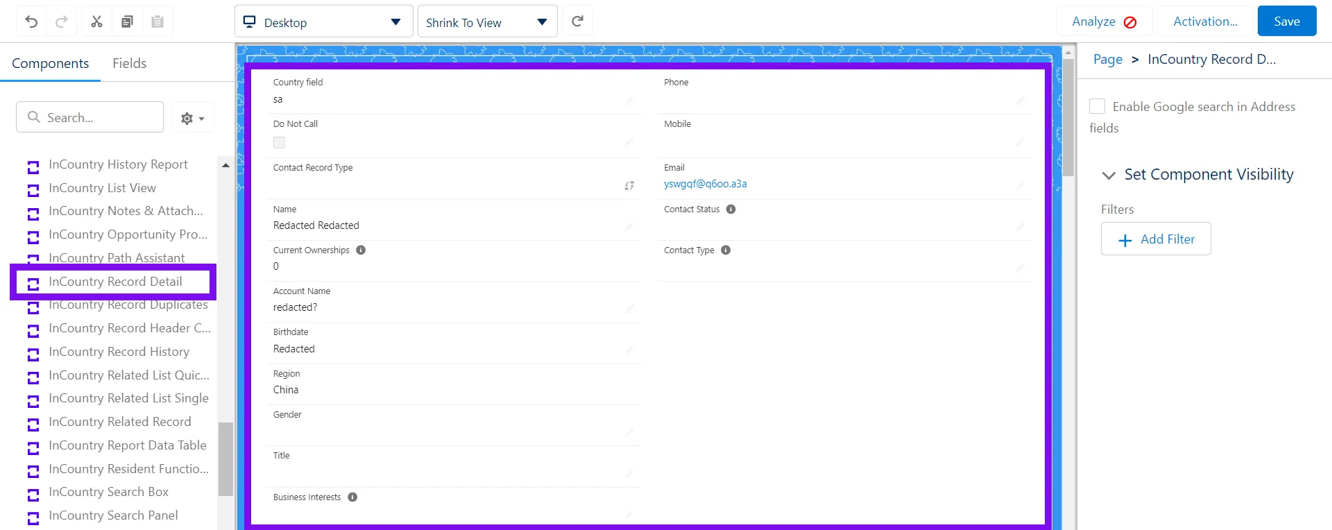 The InCountry Activity Record Detail component is displayed in the record details view only.