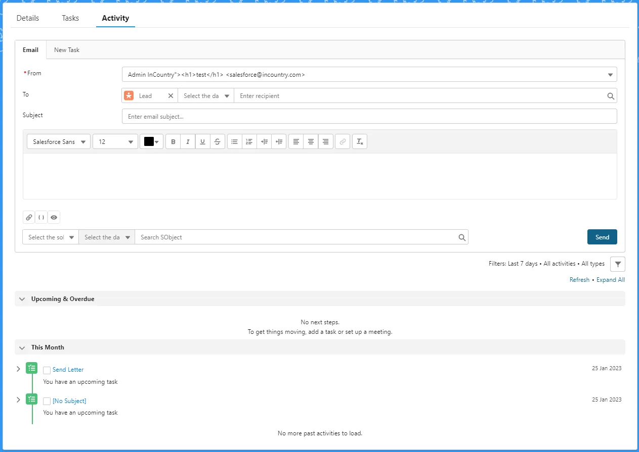 The Activity component allows you to manage tasks, log calls, and schedule events with your customers and prospects. InCountry’s equivalent of this component resembles the native Salesforce component and provides a similar user experience.