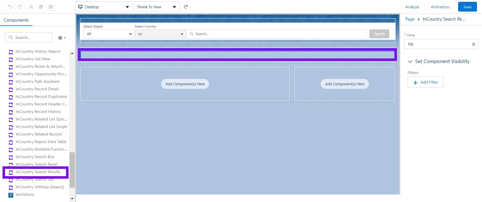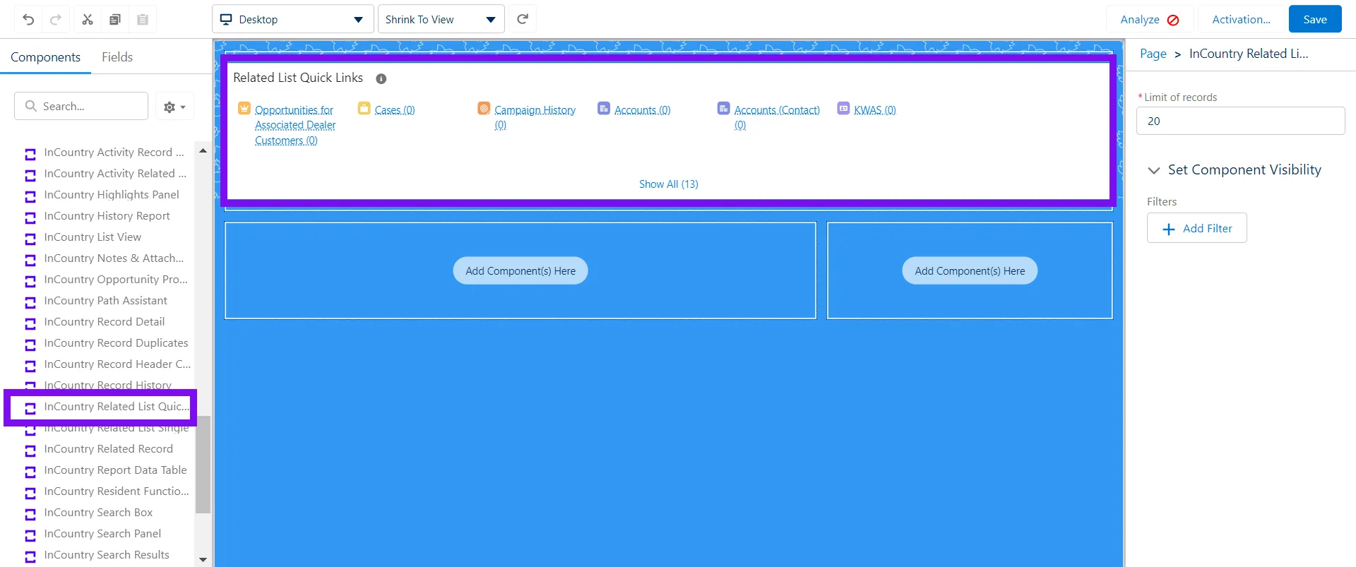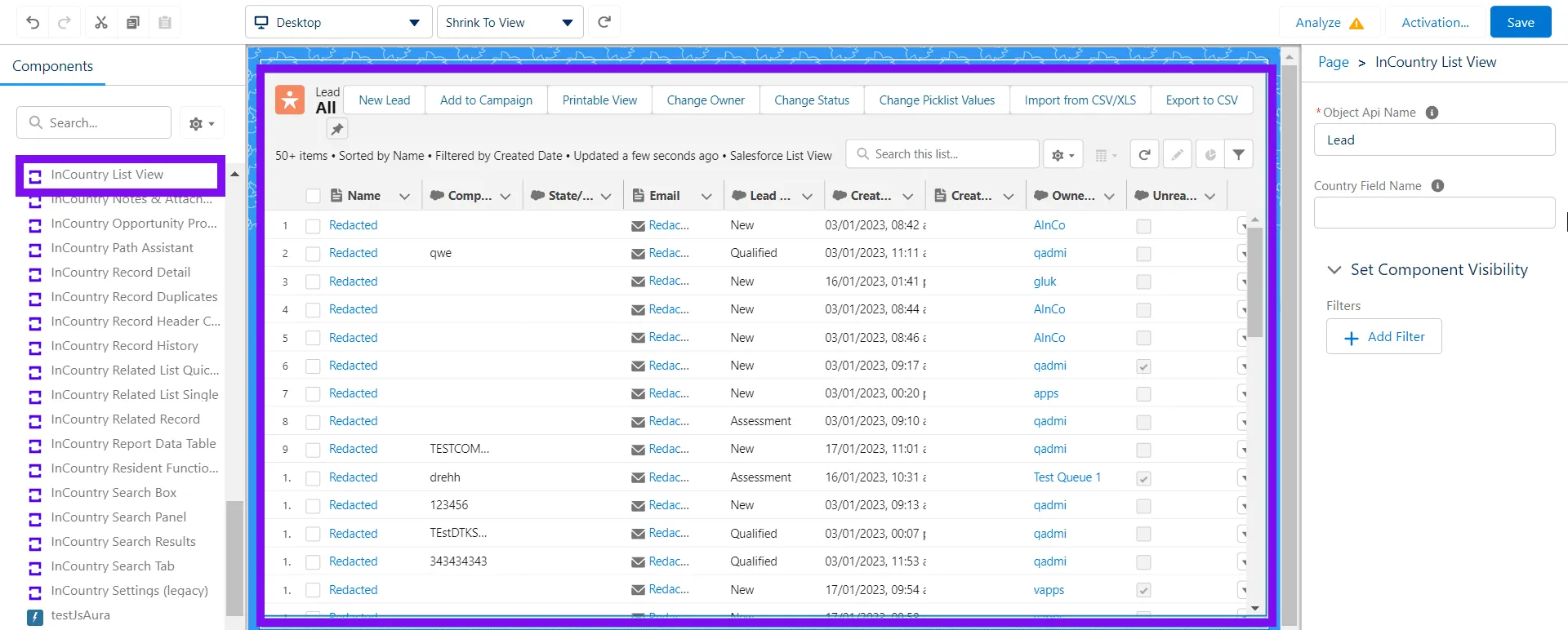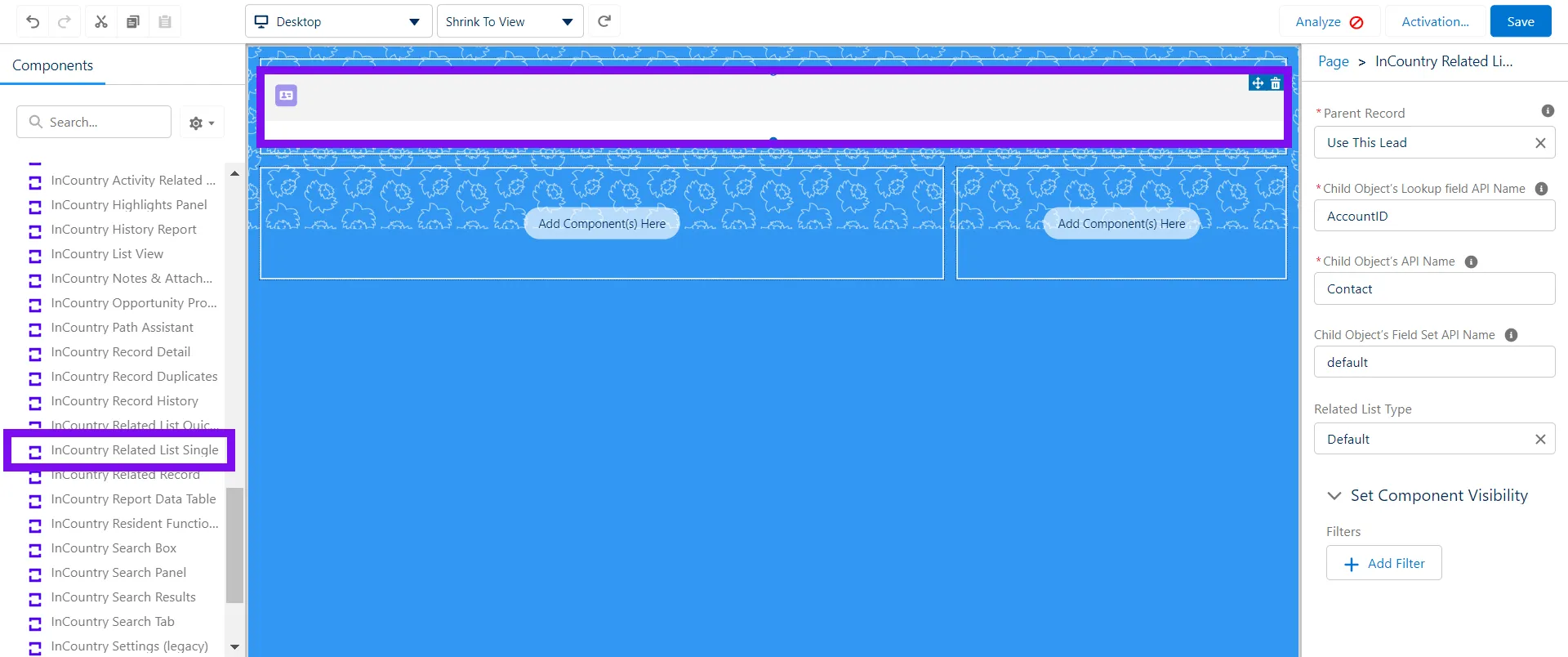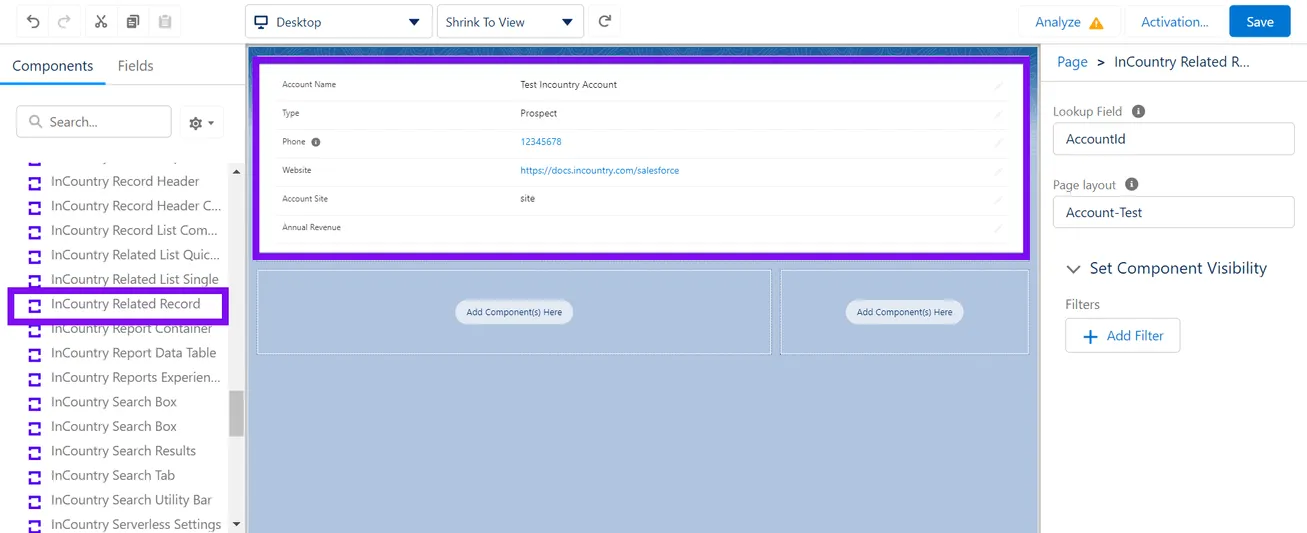 The InCountry Activity Related List Single component is displayed in the record details view only.